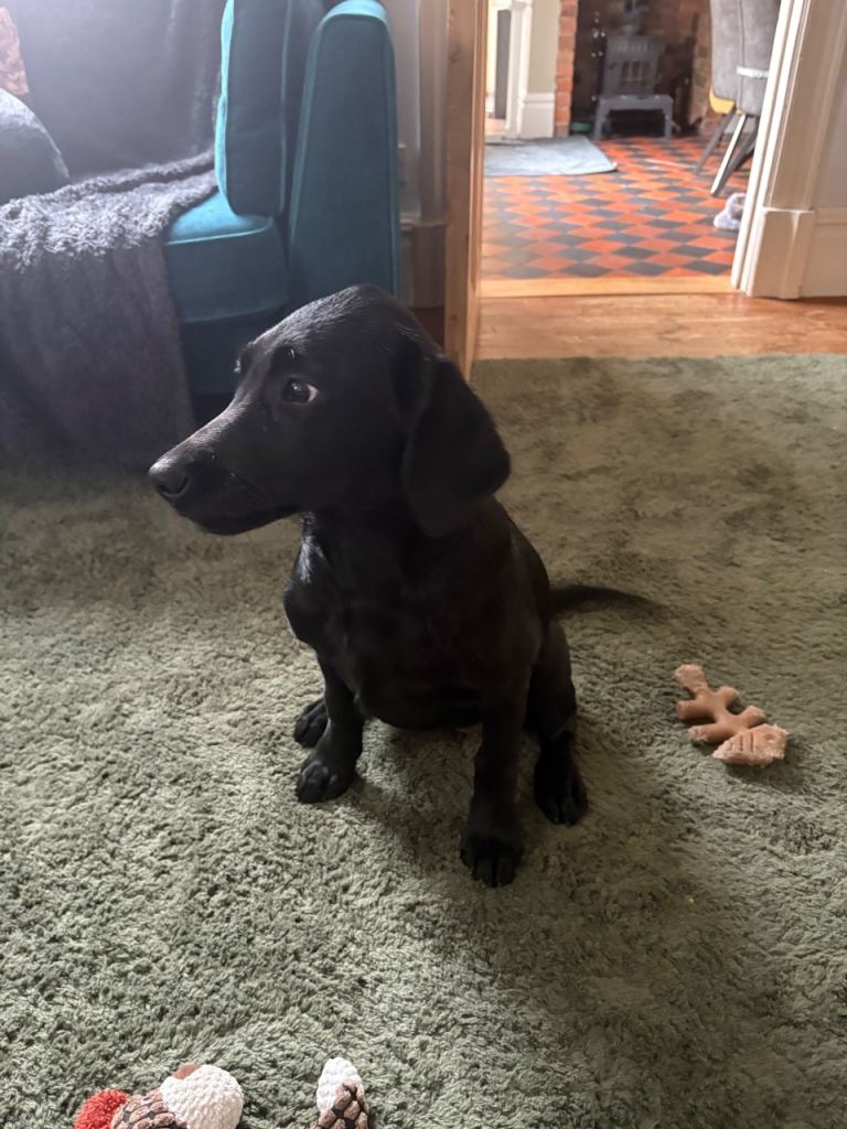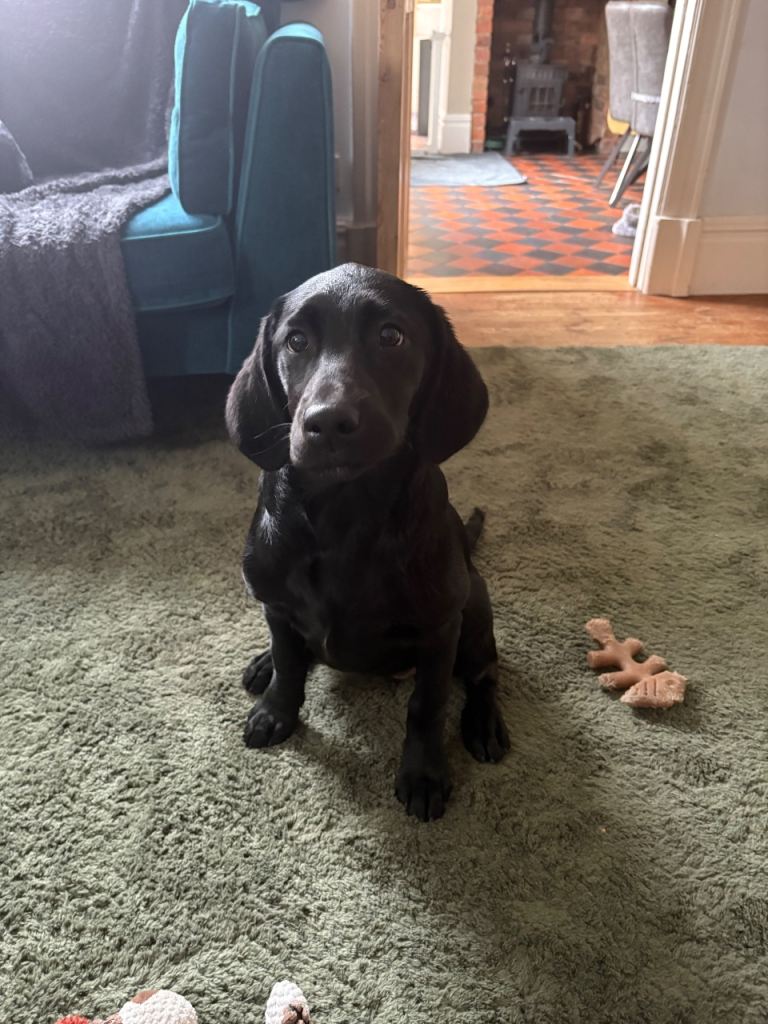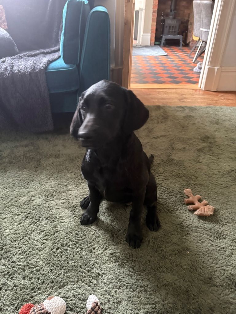 Raven is looking for a very special home she has an umbilical hernia which doesn’t affect her at all she is the daughter of my black Labrador Bella as you can see in the picture mum has the red collar on she is a typical lab puppy full of beans we kept her back so my vet could keep an eye on her hernia my vet is very happy with her so it’s now time to find her new family
