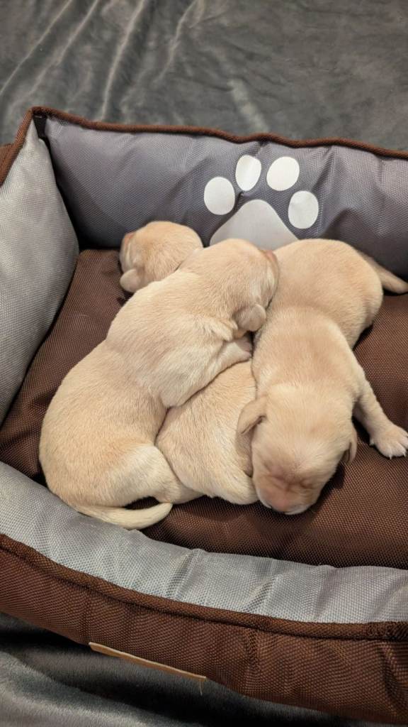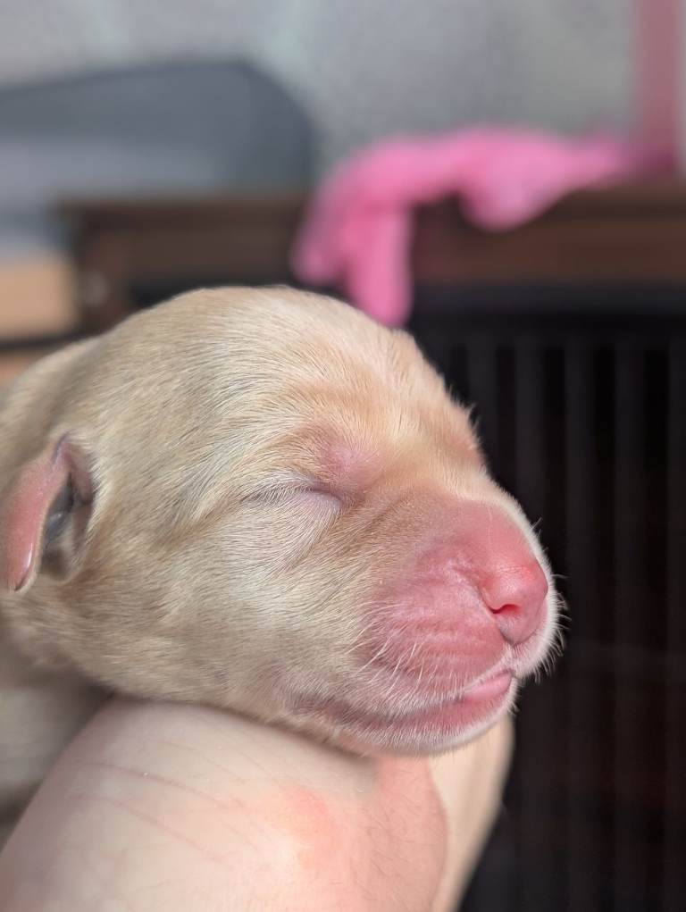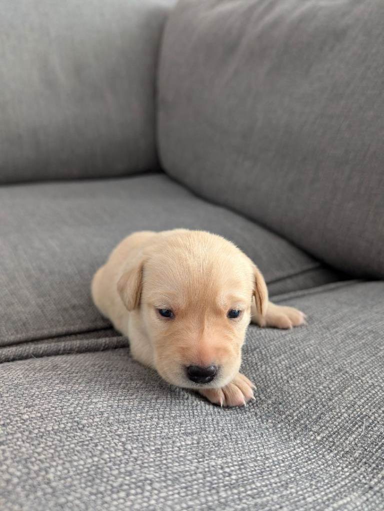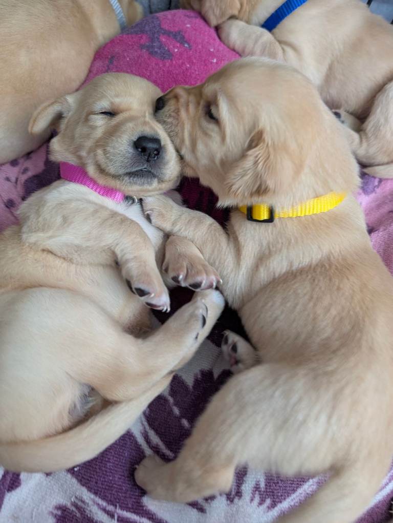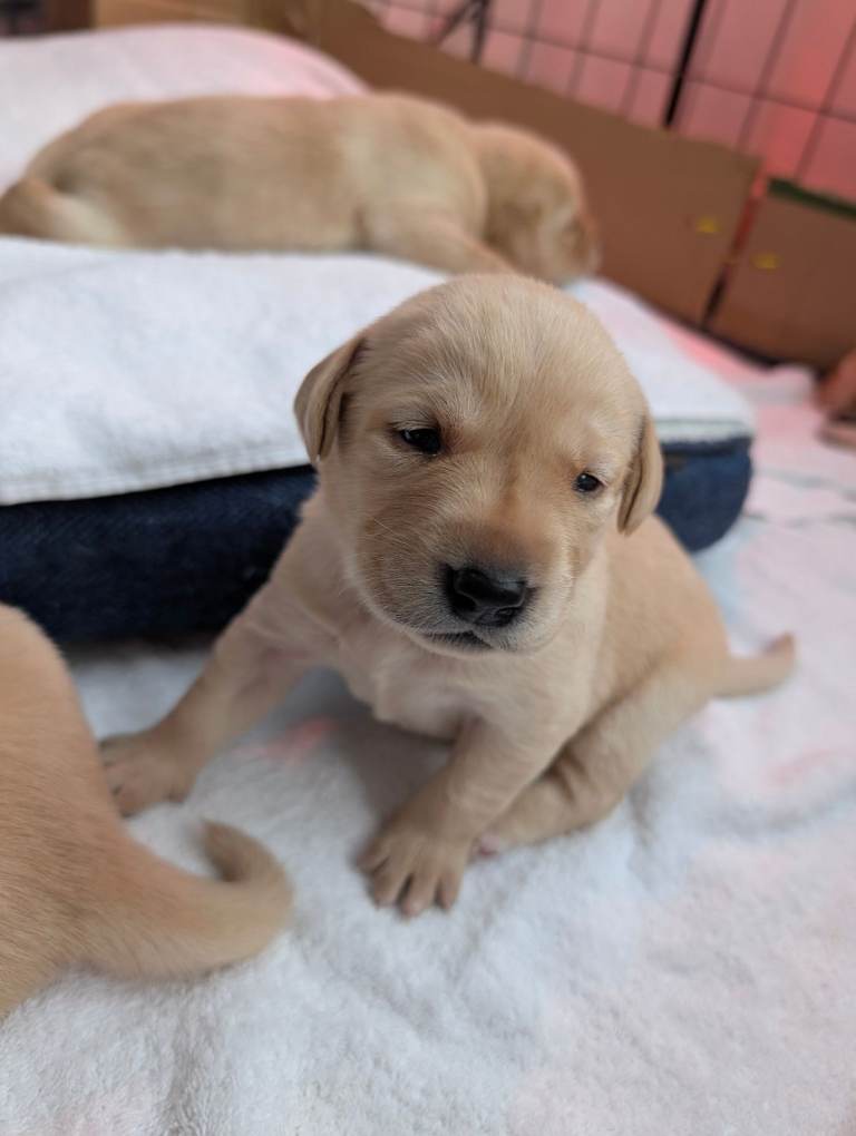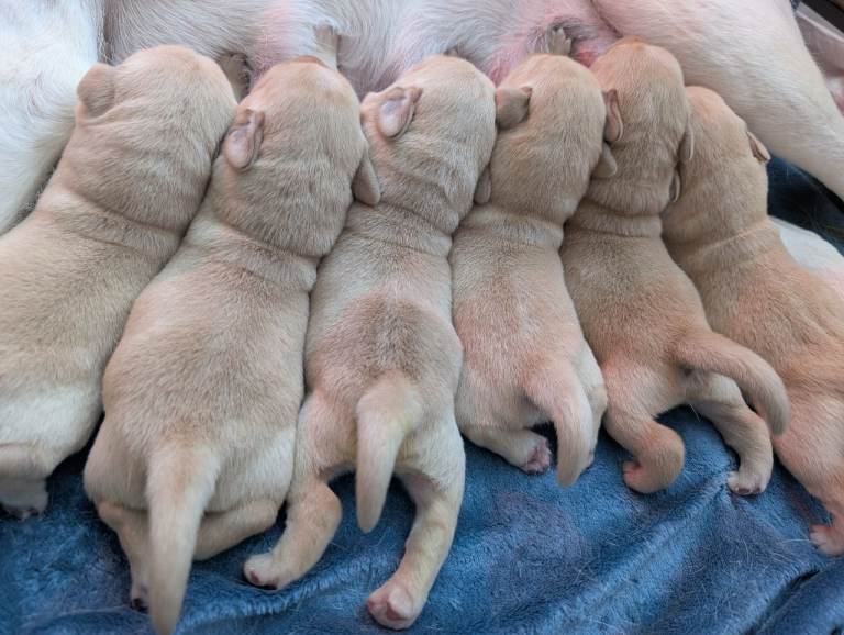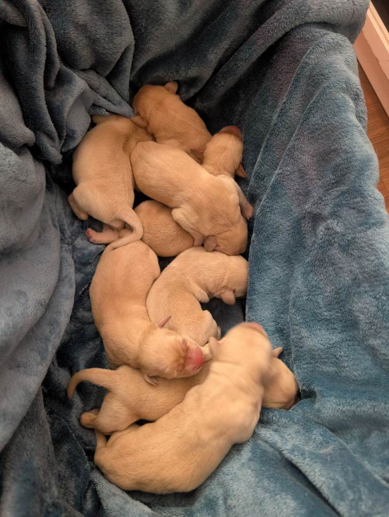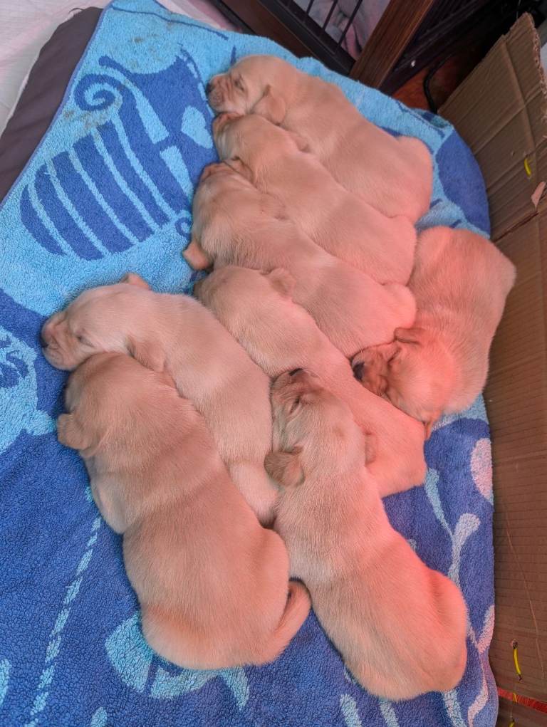 There are 3 girls and 5 boys, all born on 25th February.Mum is a yellow (white) Labrador, turning 3 years old this April, and this is her first litter. She is a loving family pet with a gentle, kind temperament.