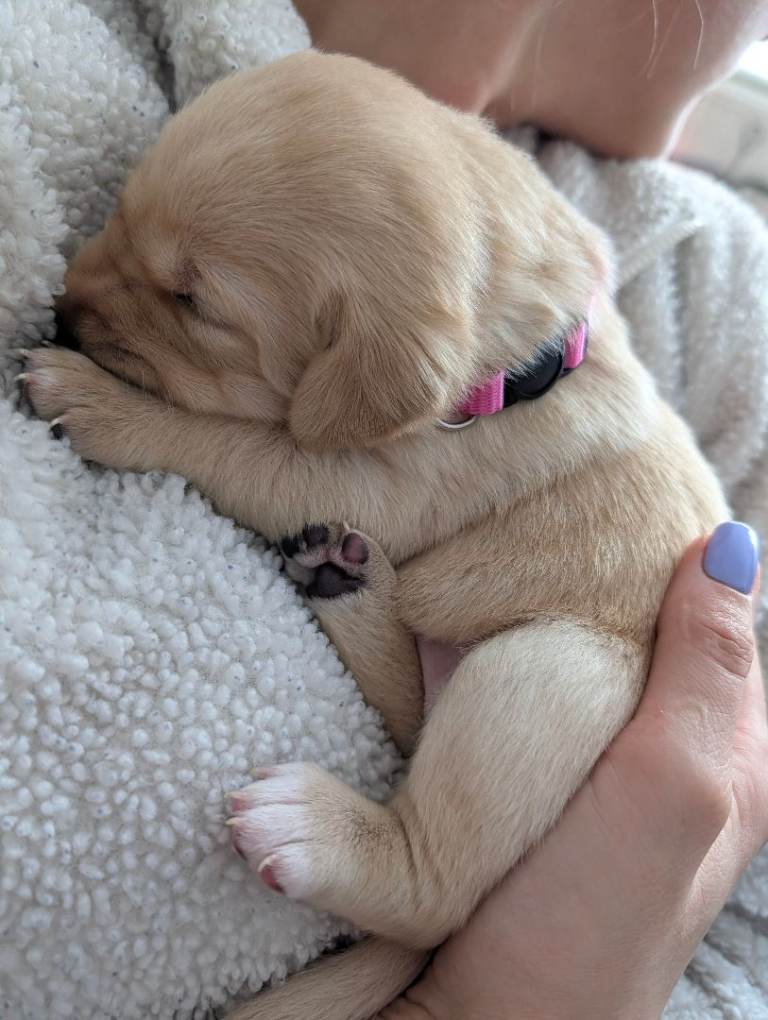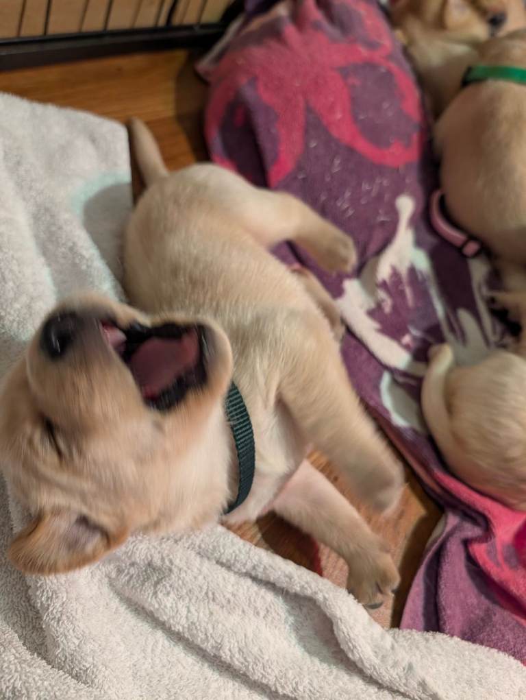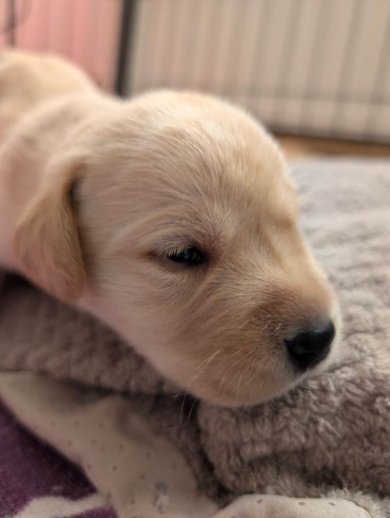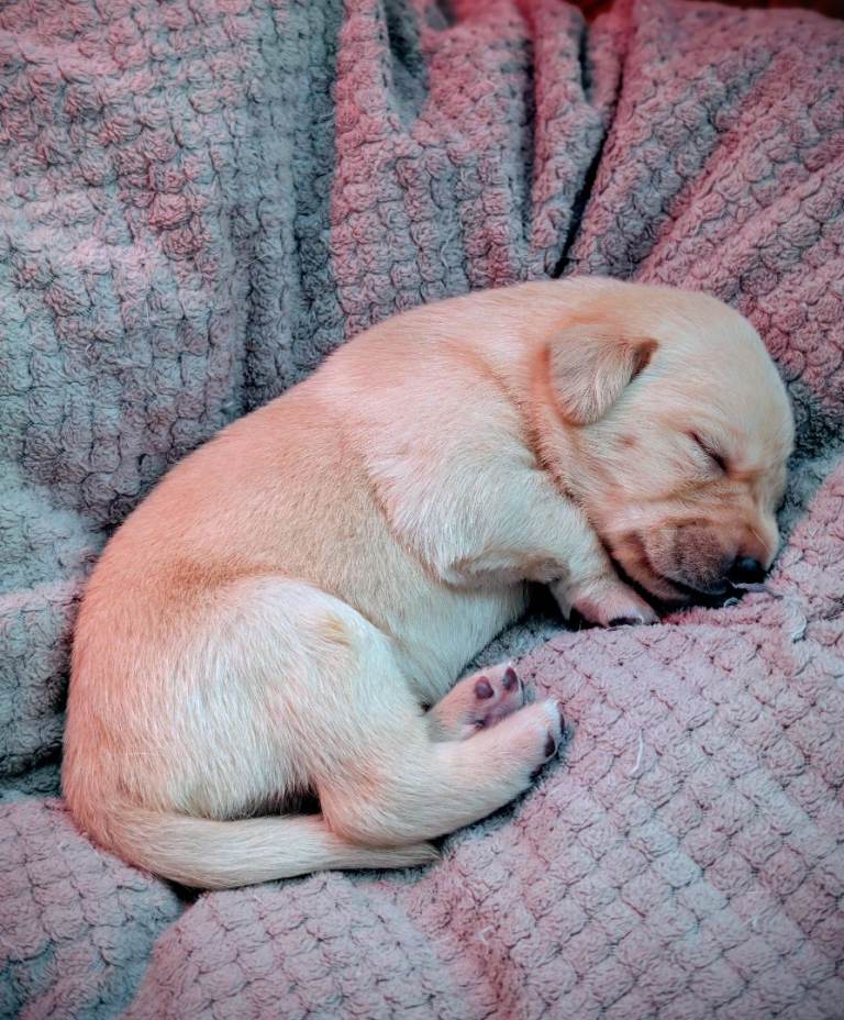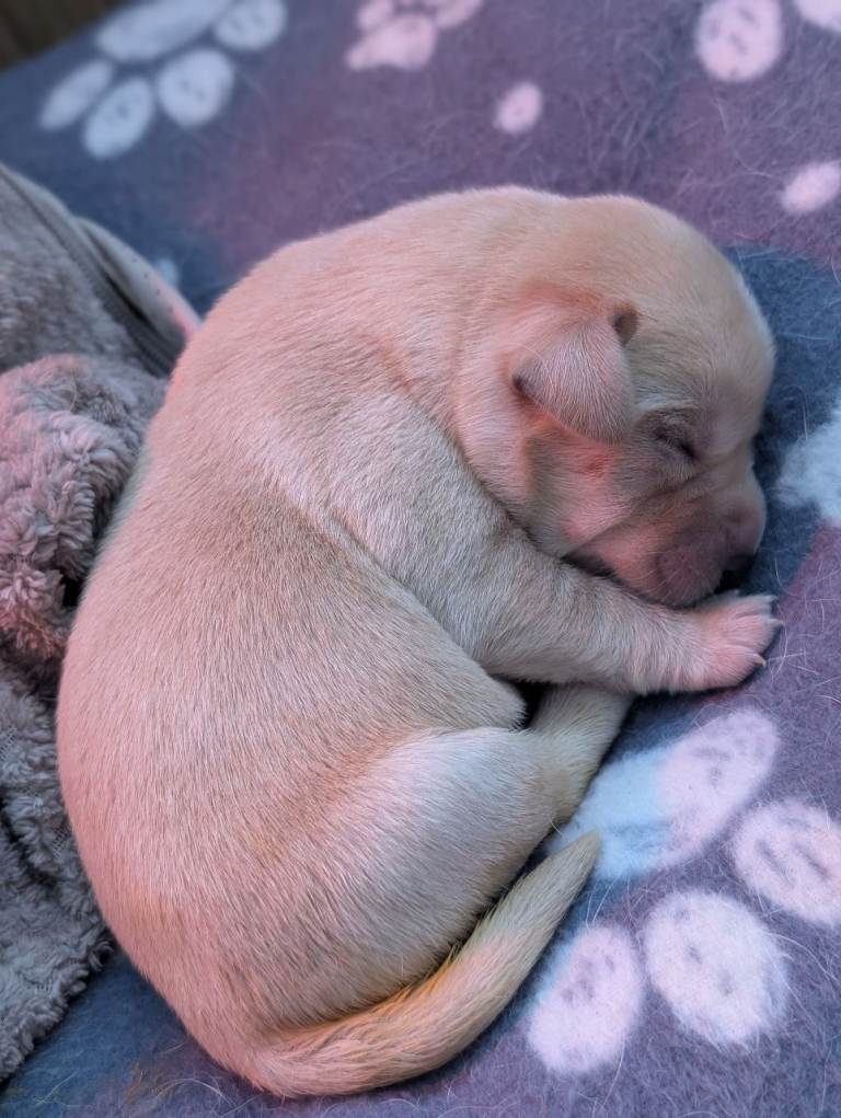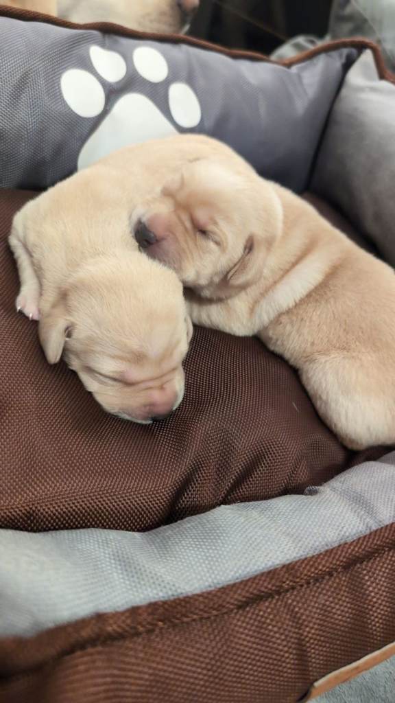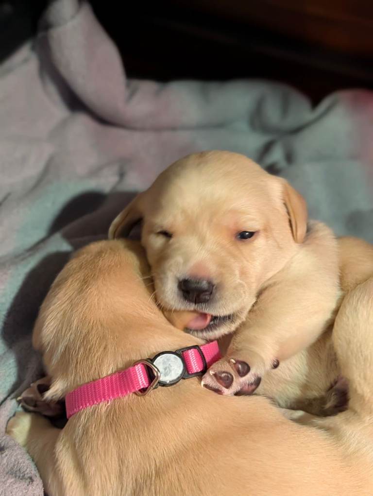 There are 3 girls and 5 boys, all born on 25th February.Mum is a yellow (white) Labrador, turning 3 years old this April, and this is her first litter. She is a loving family pet with a gentle, kind temperament.