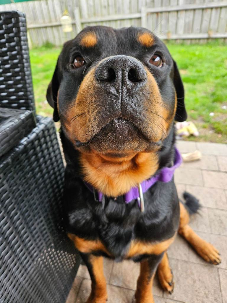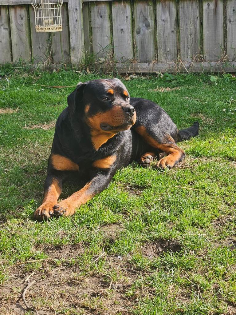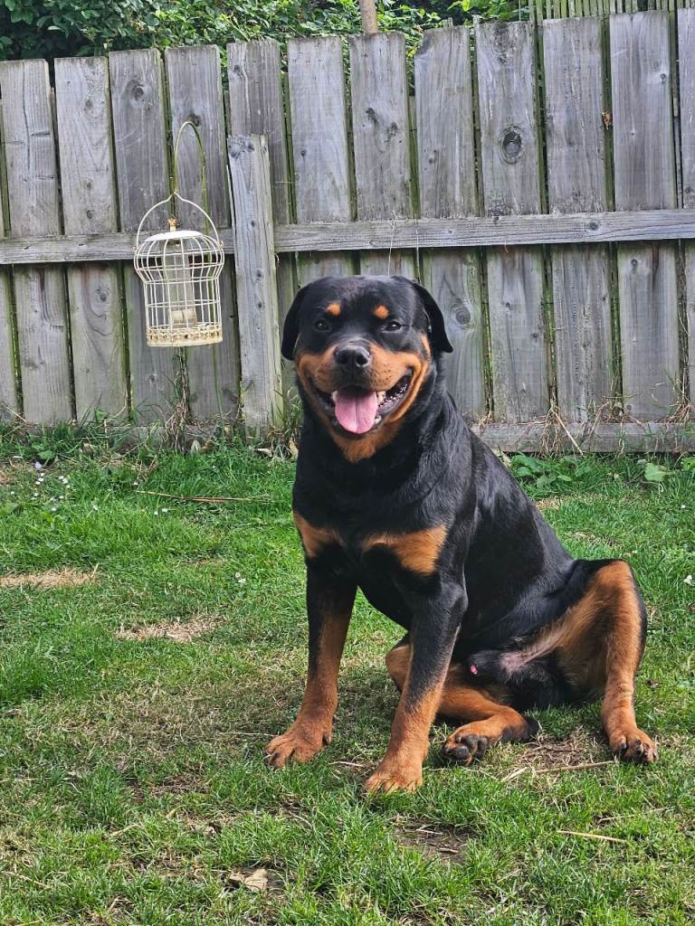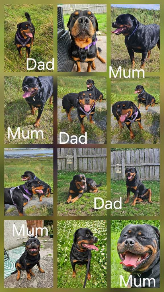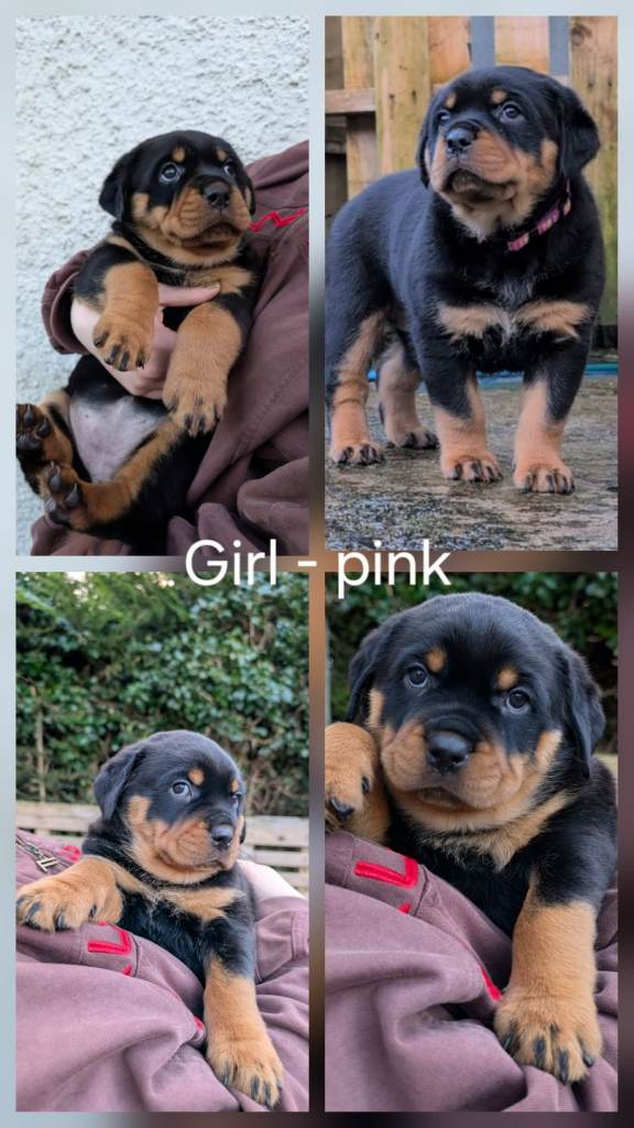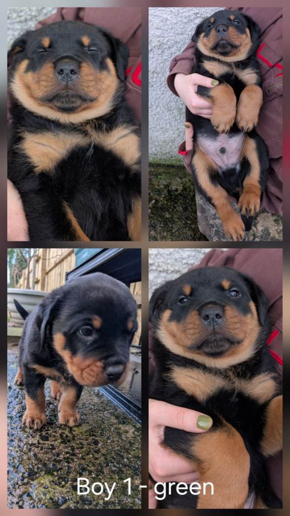 4 rottweiler pups looking their forever home. 3 boys, 1 girl. Gorgeous, chunky and affectionate pups. First vaccinations done, due their second jab in few weeks. Deflead. Dewormed. Microchipped. Health checked by vet. Mum can be seen - mum and dad both are cuddle bugs, brought up as family pets (older/adult children) so puppies are used to all household noises and being handled.