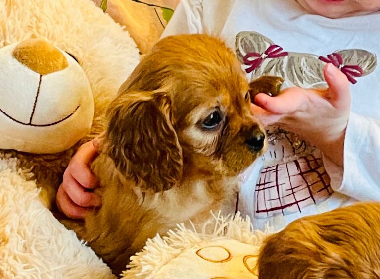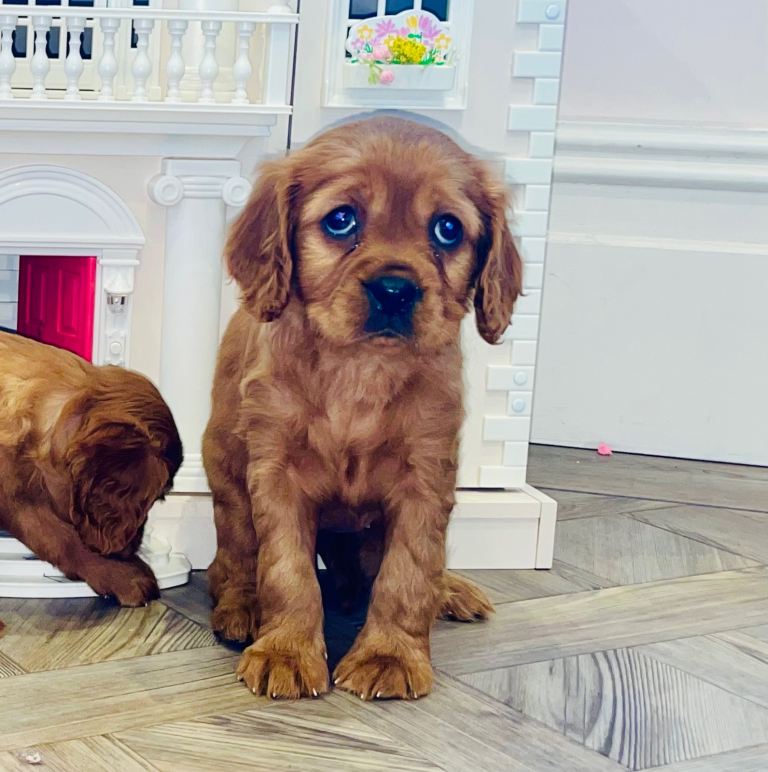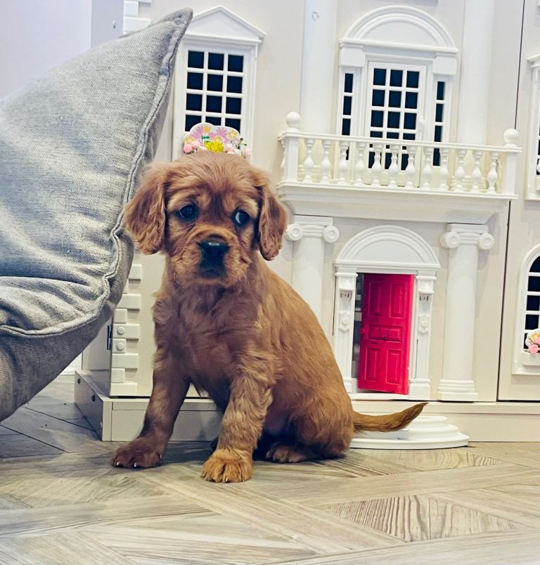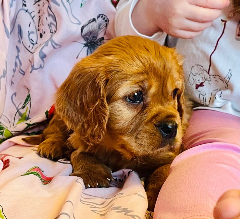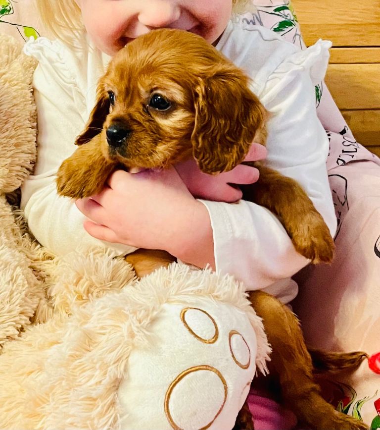 Father dog is a friend’s KC registered, DNA tested Ruby King Charles. He is a friendly character, loves running about in the woods and is lots of fun and loving, constantly leaving the children in giggles when we visit and playing in the garden, indoors he is a complete lap dog and peaceful calm personality. He is slightly smaller than mum with a slightly shorter nose and confirmation a little more of the toy type King Charles so puppies will be somewhere between the traditional and the toy breed type in appearance once fully grown.
