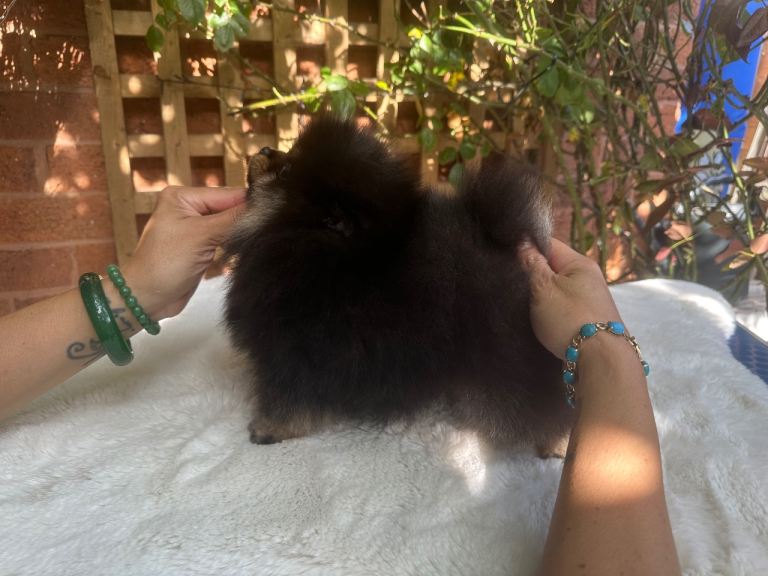 Hi introducing our absolutely gorgeous Black And Tan Pomeranians with Russian/Taiwan bloodlines these puppies come with amazing pedigrees over 17 champions on Mom’s side and 15 champions on Dads side five generation kennel club registration mum and dad are both fantastic pure Black And Tan markings lovely little turned up noses beautiful solid strong short legs and Kobe bodies just how a Pomeranian should be. We will not be taking any offers so our price is firm if you do Messages in regards to the little boy or girl mum and dad can also be seen as they are our precious pets we are asking 3000 each and they will come with their paperwork. All injections are current they have had both sets so there won’t be any more that they need they are micro chipped serious enquiries only please our property is secure with Cctv and we do ask that you provide identification photo ID on arranging appointment to view. Thank you so very much.