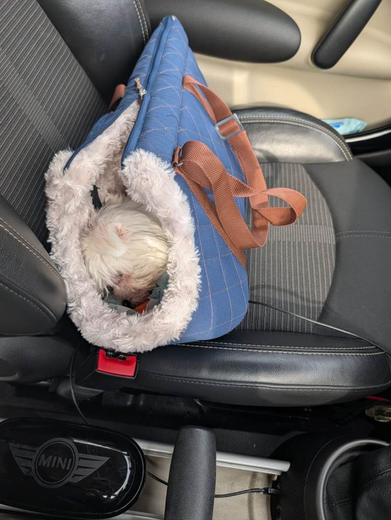 Beds harness, leash and puppy hand bag.