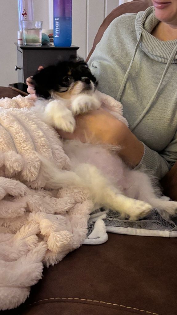 She is microchipped and will come with everything she needs to settle into her new home, including her crate, bed, blankets, toys, and any food we have left. She hasn't had her vaccinations yet, so these will need to be arranged by her new owner.