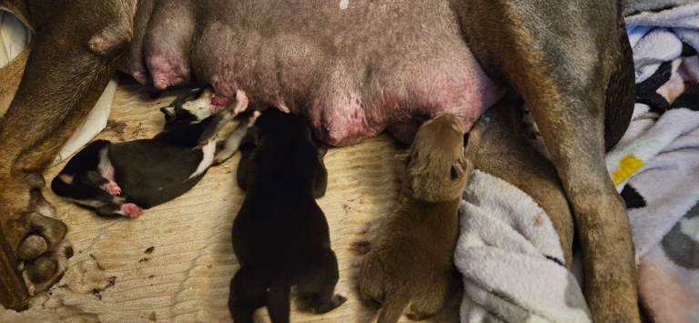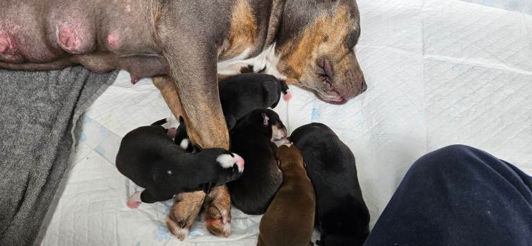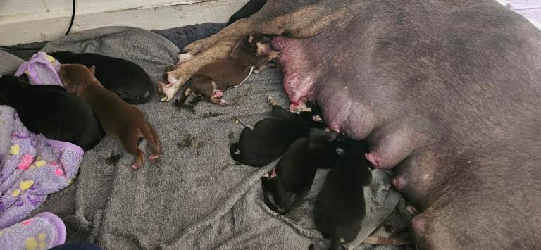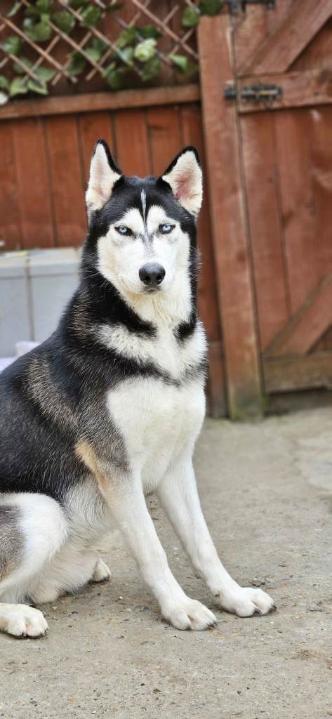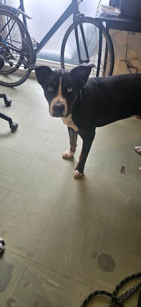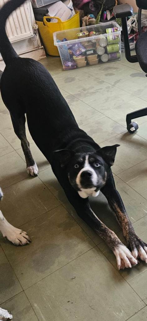 I have 1 male the dad is a siberian husky and the mum is a cane corse cross staffy. the boy is the black one with blue eyes .I need family home for him or someone that has time for dogs.