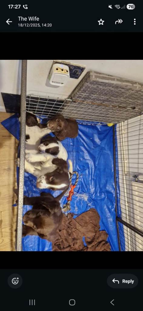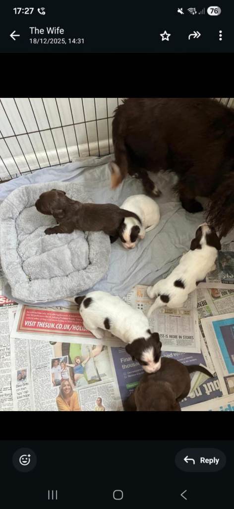 13 week old male sprocker pup. House trained, does a few basic commands, vet checked, microchipped and has 2nd jab on 20th january which is already been paid for. Upto date with flea and worm. Good with other dogs, not so much with cats. Pictures of mum (brown) and dad