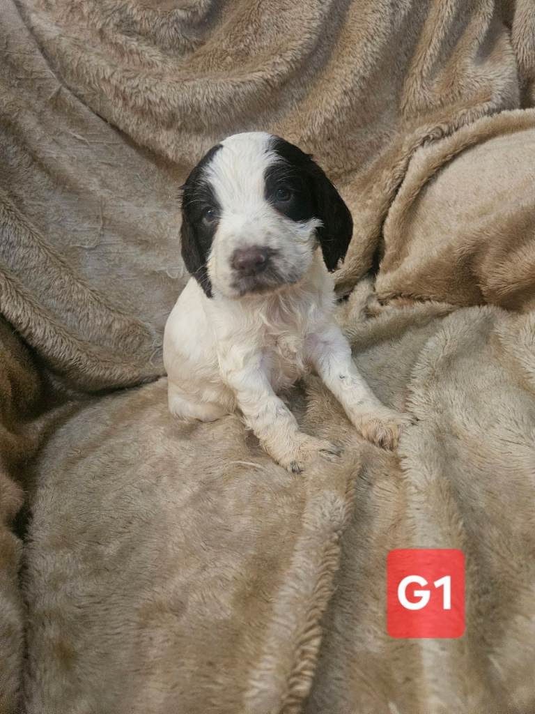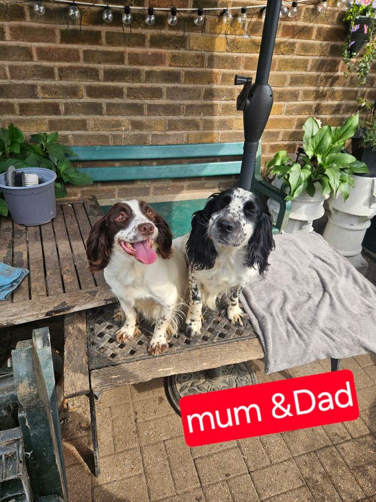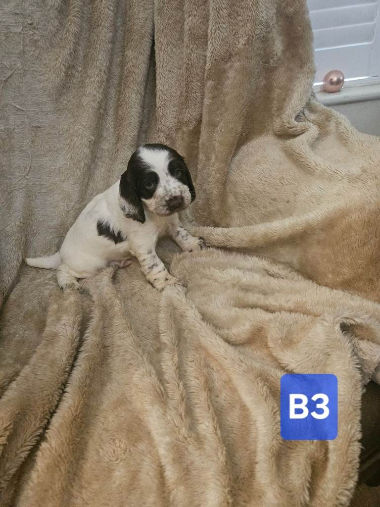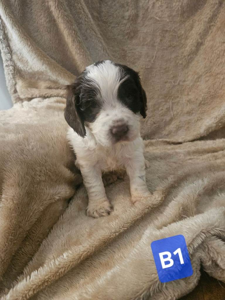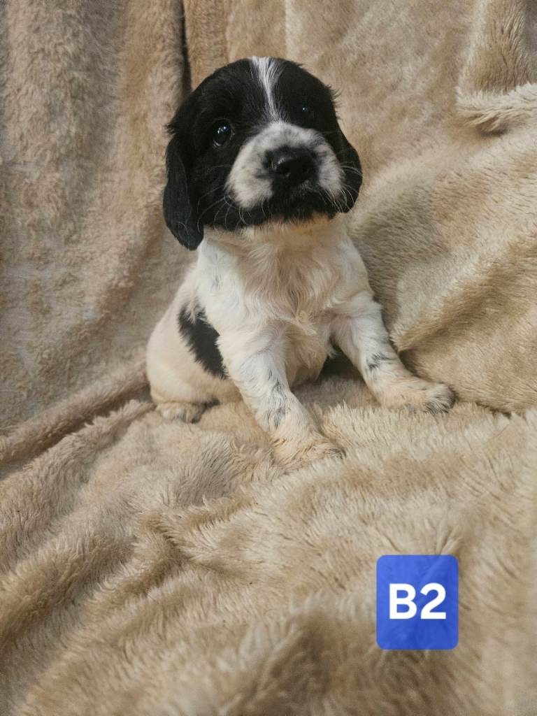 sprocker spaniel puppies from working parents. 3 males 2 females 5 weeks old . liver and white , black and white. Mother is a small springer spaniel dad is a black and white roan cocker. pups will have all injections , wormed flead to date , any further information contact for more details .