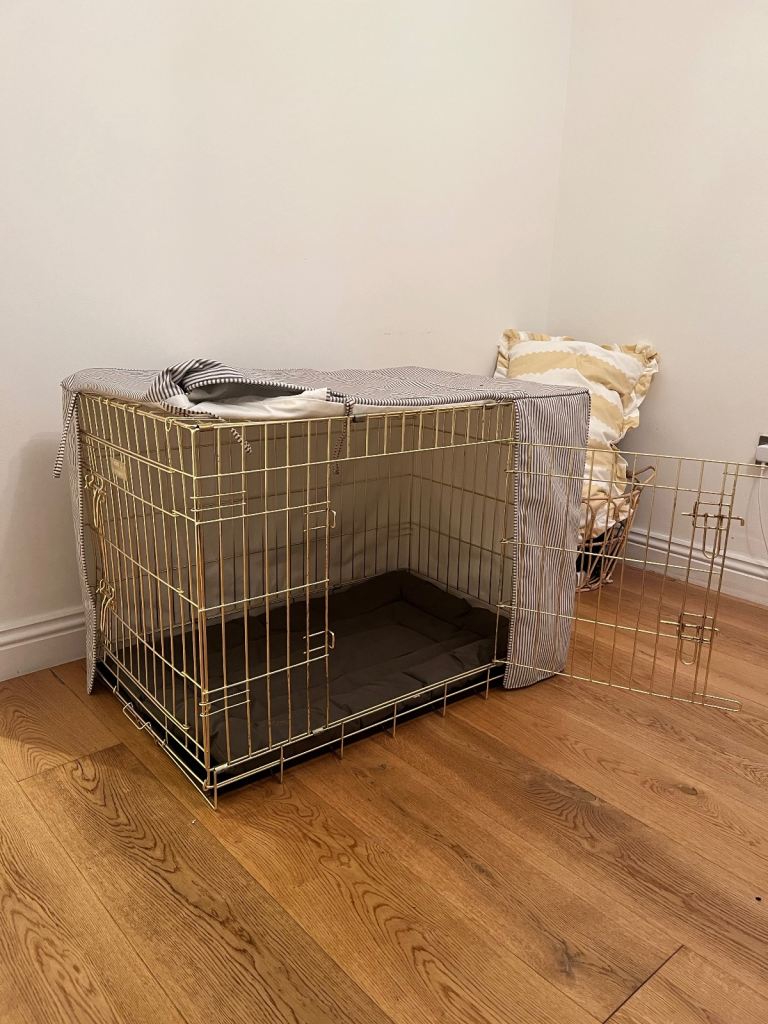 We've got her used to a crate if this is something the new owners needed in a dog.