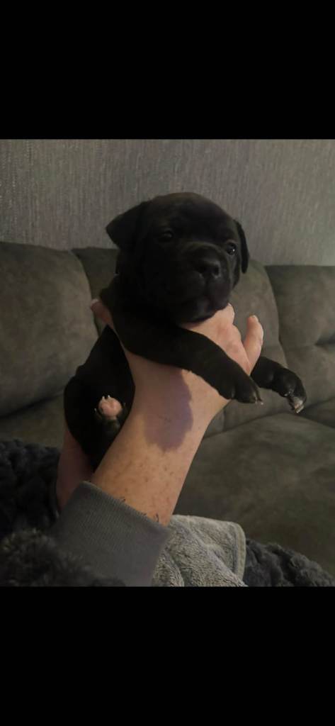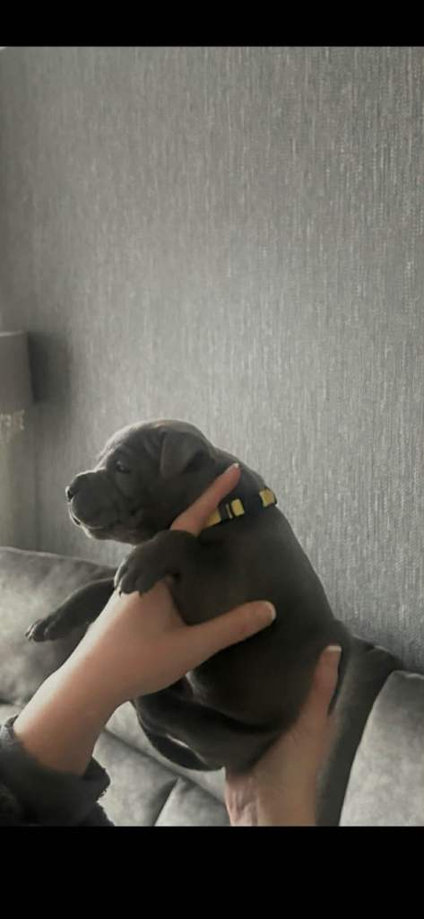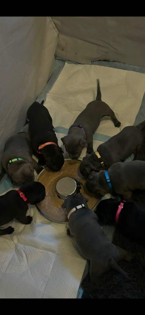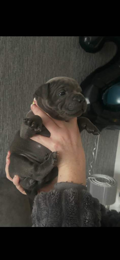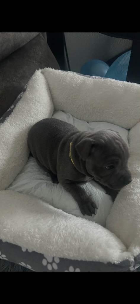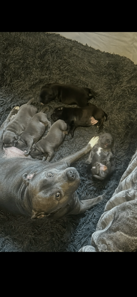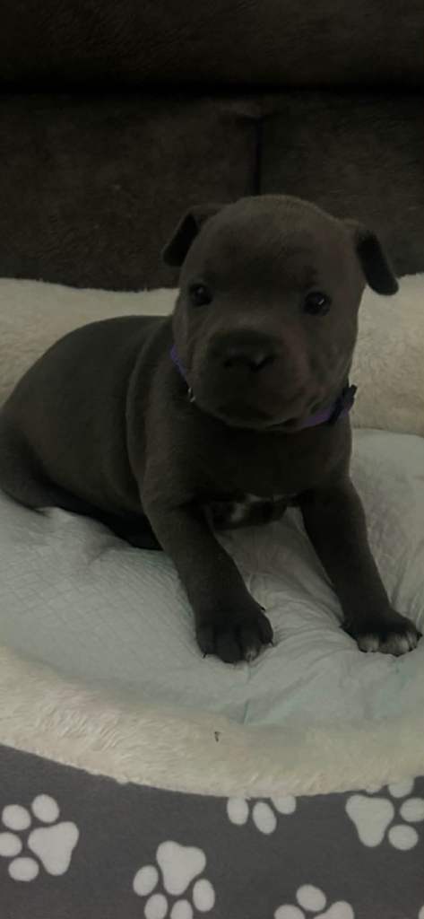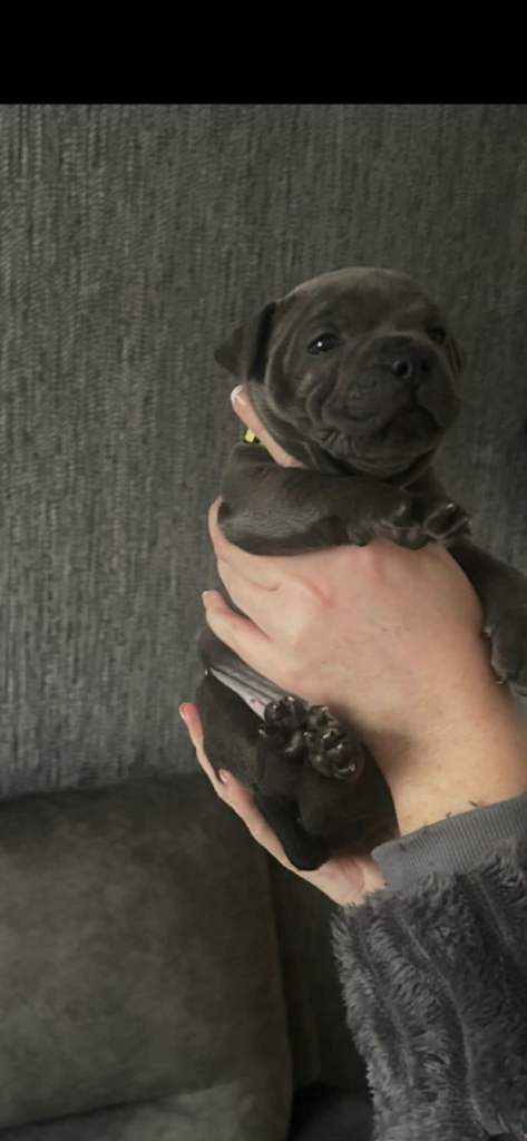 We have 3 beautiful Staffordshire Bull Terrier puppies looking for their forever families — 1 girl and 2 boys left out of a litter of 8 . They are a gorgeous mix of blue and black-brown colouring, with lovely chunky builds and playful personalities already starting to show!
