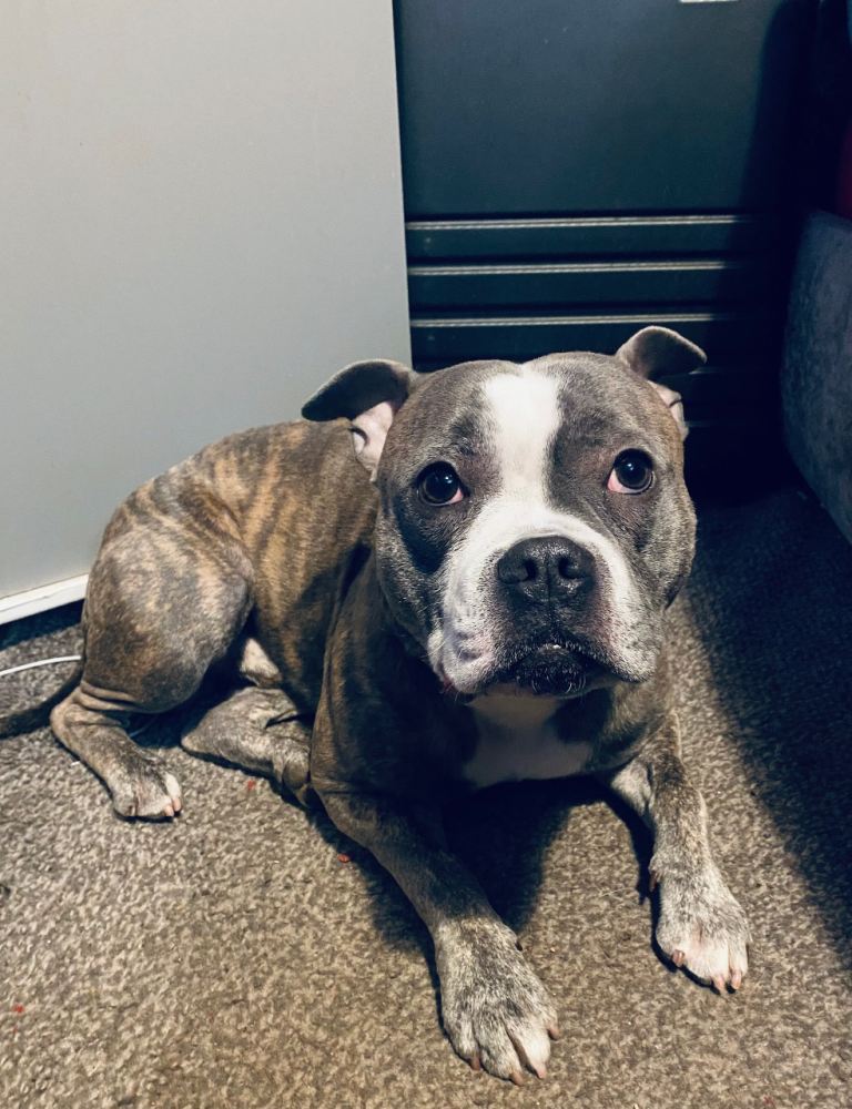 Kovo is a 2yo blue brindle staffy 1/4 bulldog mix who has recently suffered a loss of his previous owner he has lived with since he was 8 weeks old to a terminal illness.
