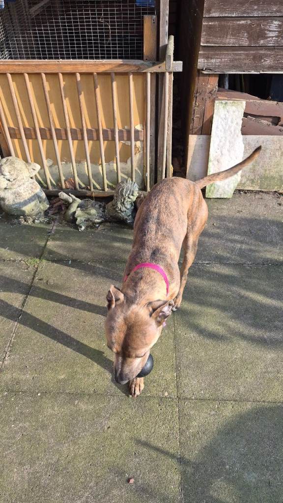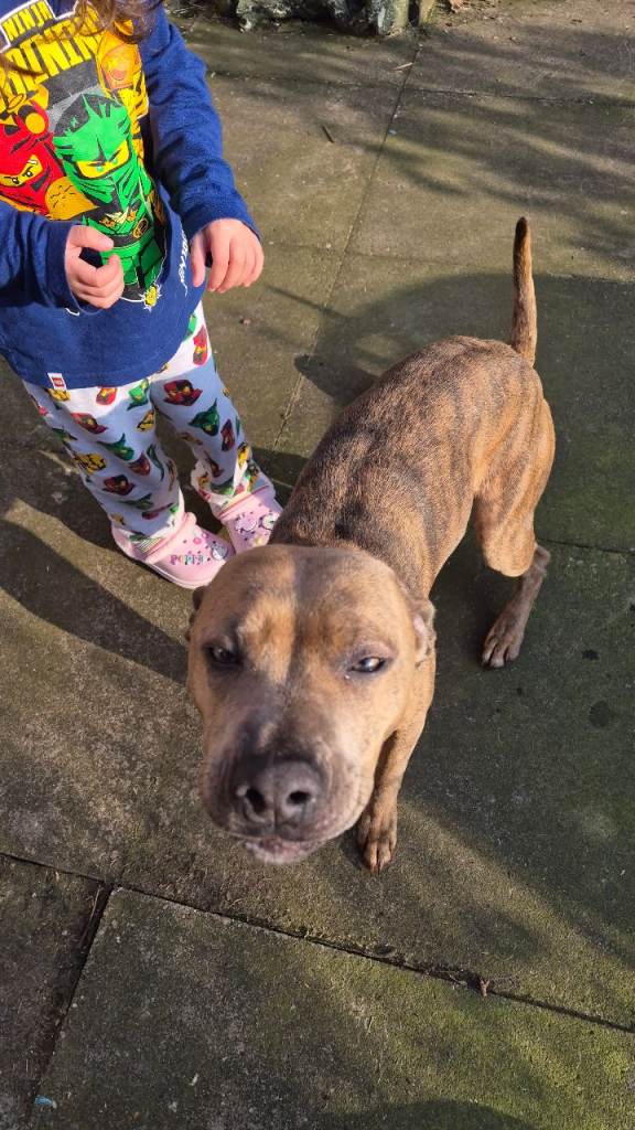 She is good with kids and other dogs. Not good with strangers and will bite. She needs proper training. She can't be left if you go out without being in a cage. She steals food. Her name is socks. Ive only walked her once on the lead. No neutered. Had first vaccinations. She is healthy. Socks is 2 years old. Need a family who will have more time for her.
