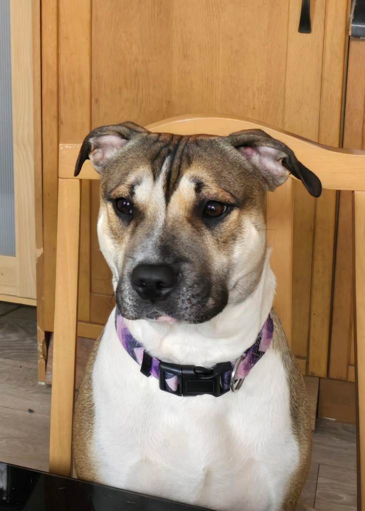 This is Millie-Rose, she is a 15 month of Staffy cross mastiff. Unfortunately we are unable to look after her anymore due to my partners ill health and myself being at work long hours during the day. She needs someone at home as she suffers with anxiety and boredom. She hasn’t been around children so we are unsure what she would be like. She loves blankets and cuddles. Not keen on cats. Please contact for more information
