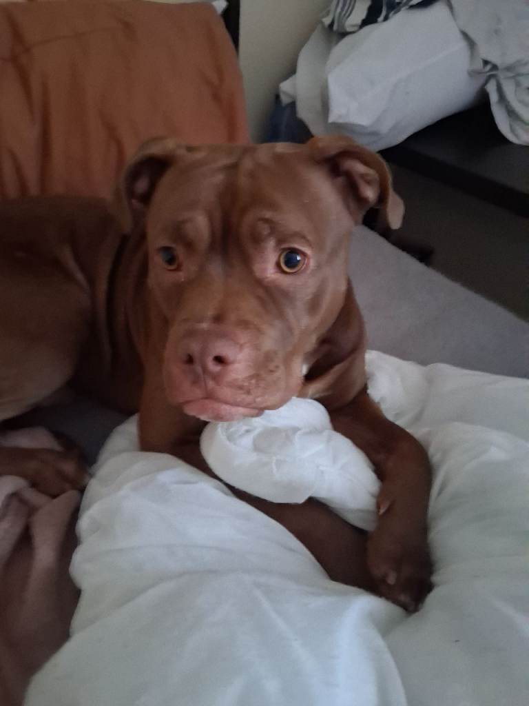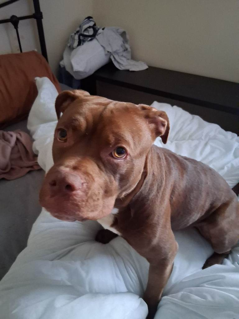 Staffy male. Free to loving suitable home.13 months old. Microchipped vaccinationrs, flead and wormed, excellent in car. Reactive to other male dogs and cats. Good recalloflead. Loves people and use to kids 8+ free to loving home