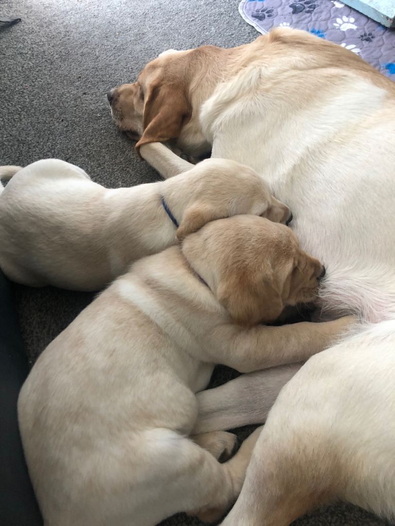 Two Labrador puppies for sale they are eight weeks and have been born and raised indoors both pups have been bottle fed along side of mom has mom had problems with her milk. Both mom and dad were pedigree Labradors with lovely temperamentS . Mom is also a registered medical alert dog