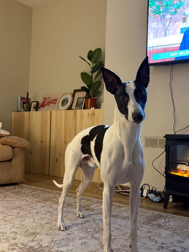 1 year old male whippet due to a change in work circumstances he’s now left home alone which he isn’t dealing with very well. He loves other dogs and he’s super friendly. Loves going for runs and cuddles.