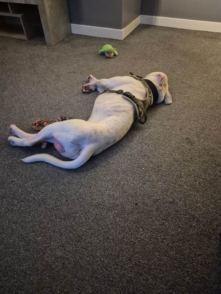 Meet Frank, a three year old white boxer dog. He is a loving big softie. Gets a bit excited when he meets new people and jumps up a lot, but eventually settles. He is quite strong on the leash. He is house trained and will let you know when needs to go by whining. He has had a few accidents in the house, but that was down to me not realising he was crying to go out. He is good with kids but as he jumps up a lot, older kids would probably be best. He loves attention and will lay with you on the couch for cuddles. He sleeps in his crate at night. He is not neutered. A change in my circumstances forces rehoming. I just want him to go to a decent home. He will come with his bowls, whatever food I have here, his crate and bed and leashes and harness.