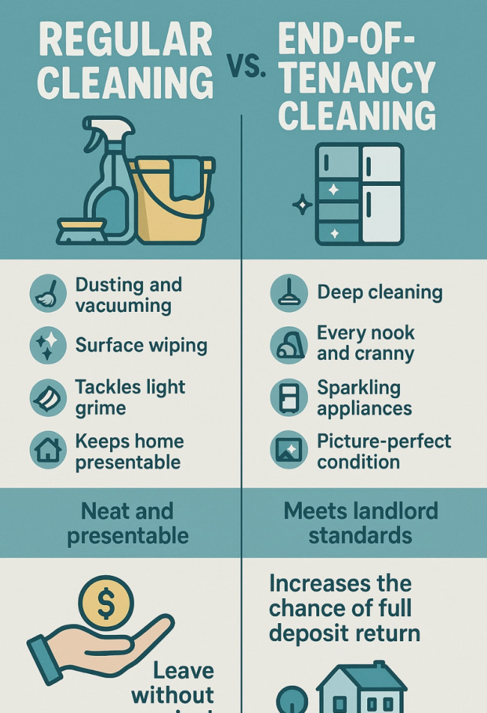 End-of-tenancy cleaning is a comprehensive, deep cleaning of a rental property that a tenant performs before moving out to restore it to the condition it was in at the start of their lease, minus normal wear and tear. This process goes beyond regular cleaning and includes details like deep cleaning ovens, inside cupboards, and behind appliances, and is crucial for a tenant to recover their security deposit.