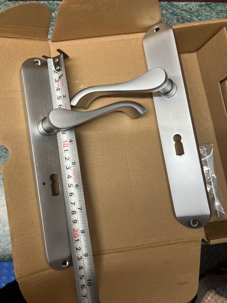Quality door handles.Nickel chrome satin finish.Holes for eqcushion keyhole cover.240mm length
