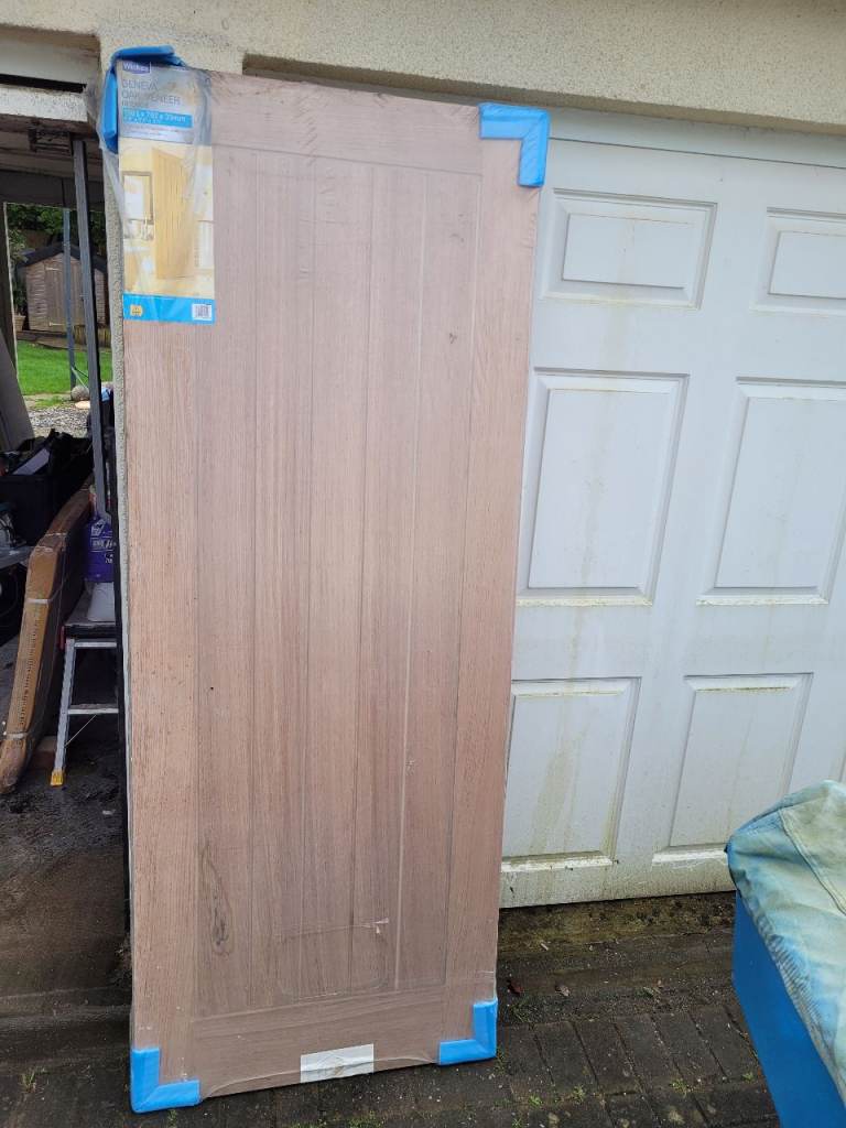 OAK VENEER DOOR. HAS BEEN STORED IN GARAGE SO MAYBE COLOUR DIFFERENCE. IDEAL FOR SHED OUT BUILDINGS ETC