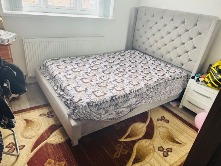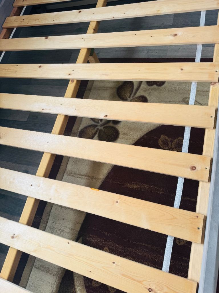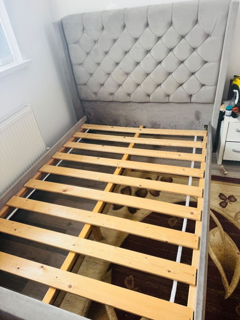 Condition is really good. Really sturdy no flimsy stuff. Button on headboard. Wooden slates and wooden feet.