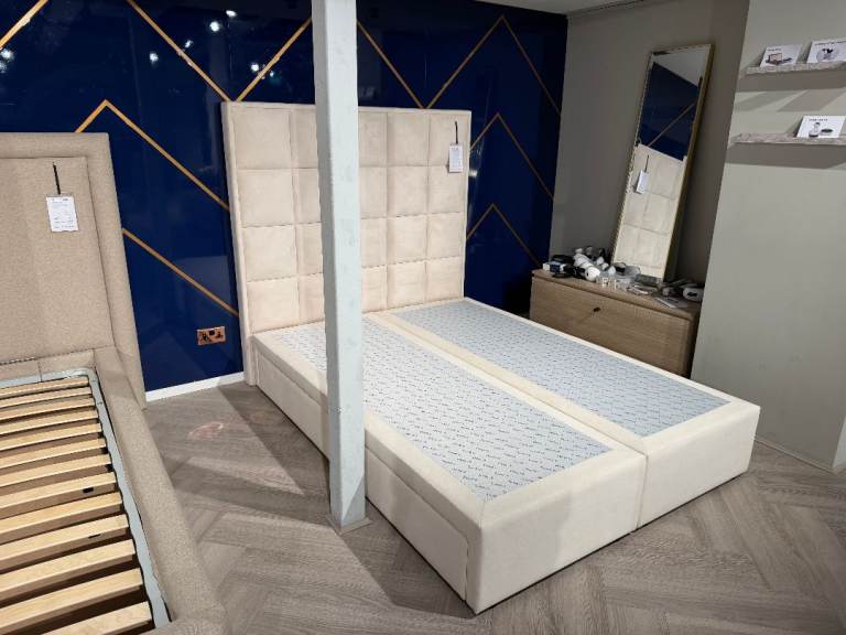 These are premium quality beds that were on display at the Kings Road, Chelsea branch of Sleep 8. They are in a variety of colours, mostly greys and beiges and in mostly velvet fabrics. Their original prices were between 2-4k Most are king size with a few doubles and super kings. We also have an electric bed with remote control operation.