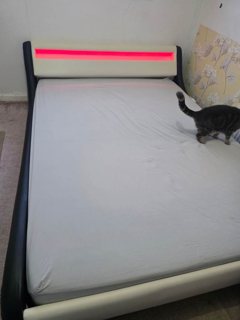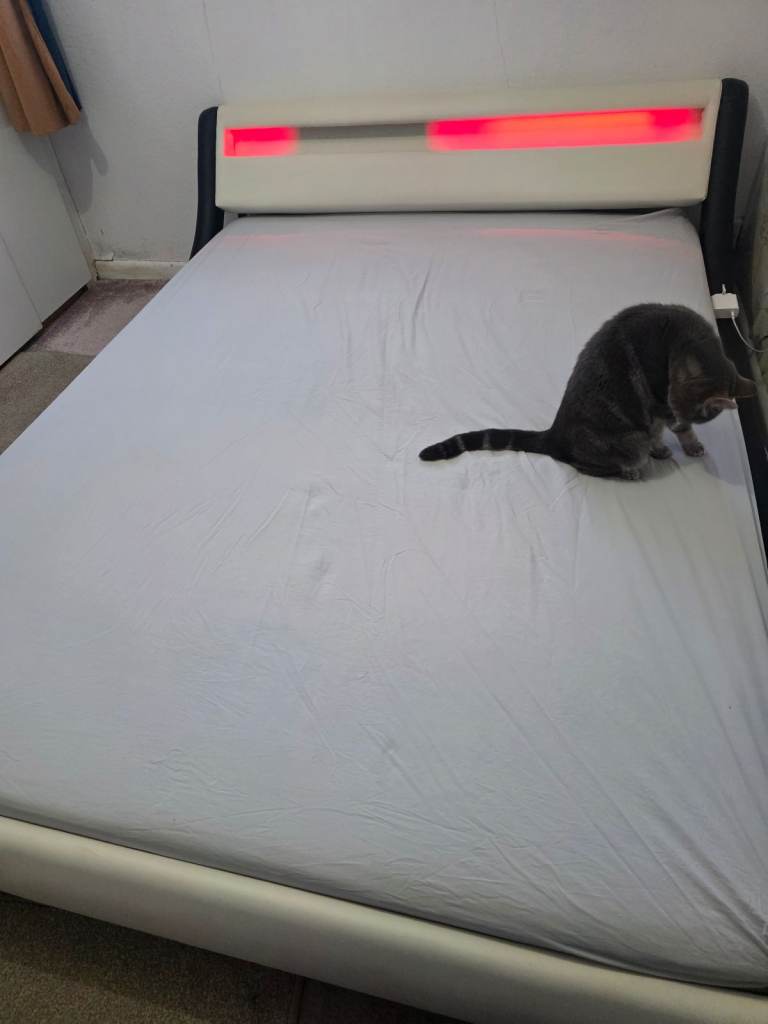 Glow-in-the-dark bedtime vibe: a bed with a multicolour headboard for cozy nights! 😴✨ also includes king-size memory foam firm mattress .please note Cat not included.