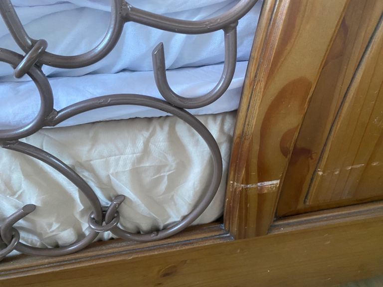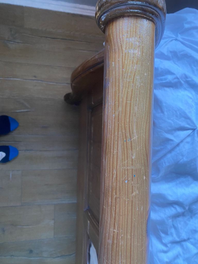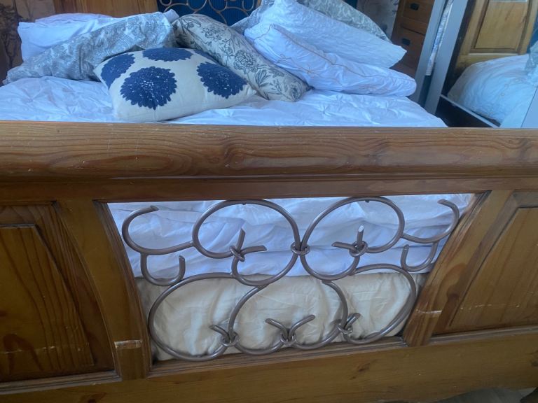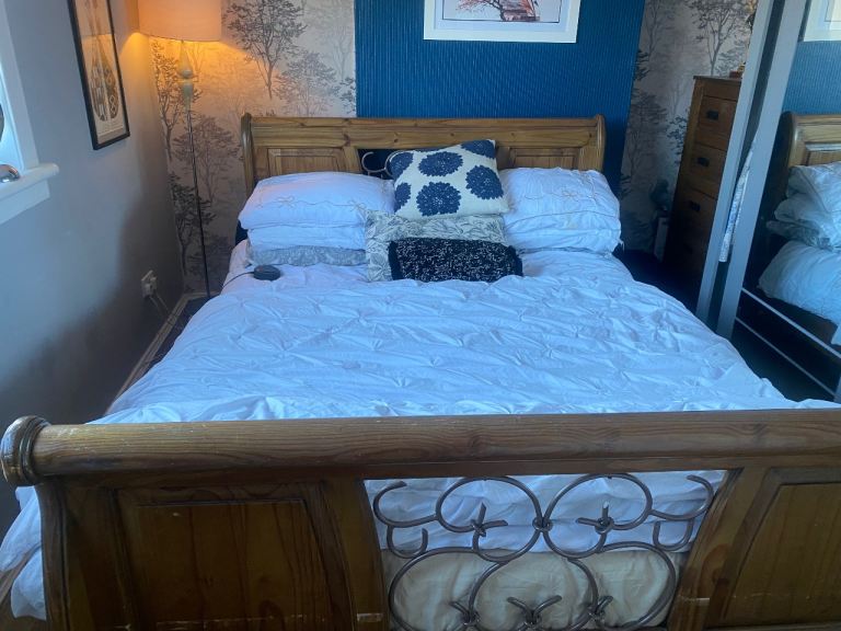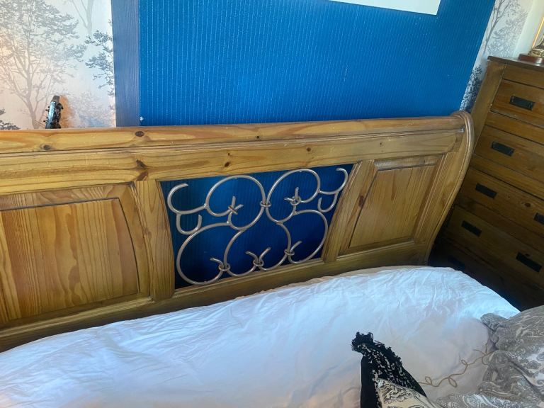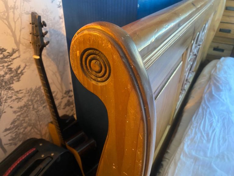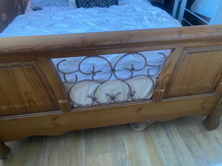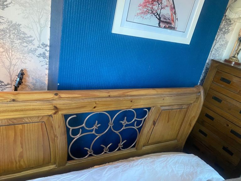 This bed is absolutely gorgeous. A star feature for your bedroom. Has slight minor marks on it thst need some wood stain , only minimum TLC required. Iv posted photos to show these snd other littke marks, but overall it adds to the old wooden look of it. This bed cannot be purchased anywhere. Stopped making them 20 years ago, so very rare to find and would cost a fortune to buy now. Was a luxury buy at the time. Will be dismantled for oick up. Bought for £865 selling for only £120. Measurements 7ft by 5ft 8ins