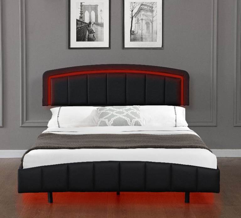 Black faux leather floating-style bed frame LED headboard + under-bed LED strip for a premium floating look