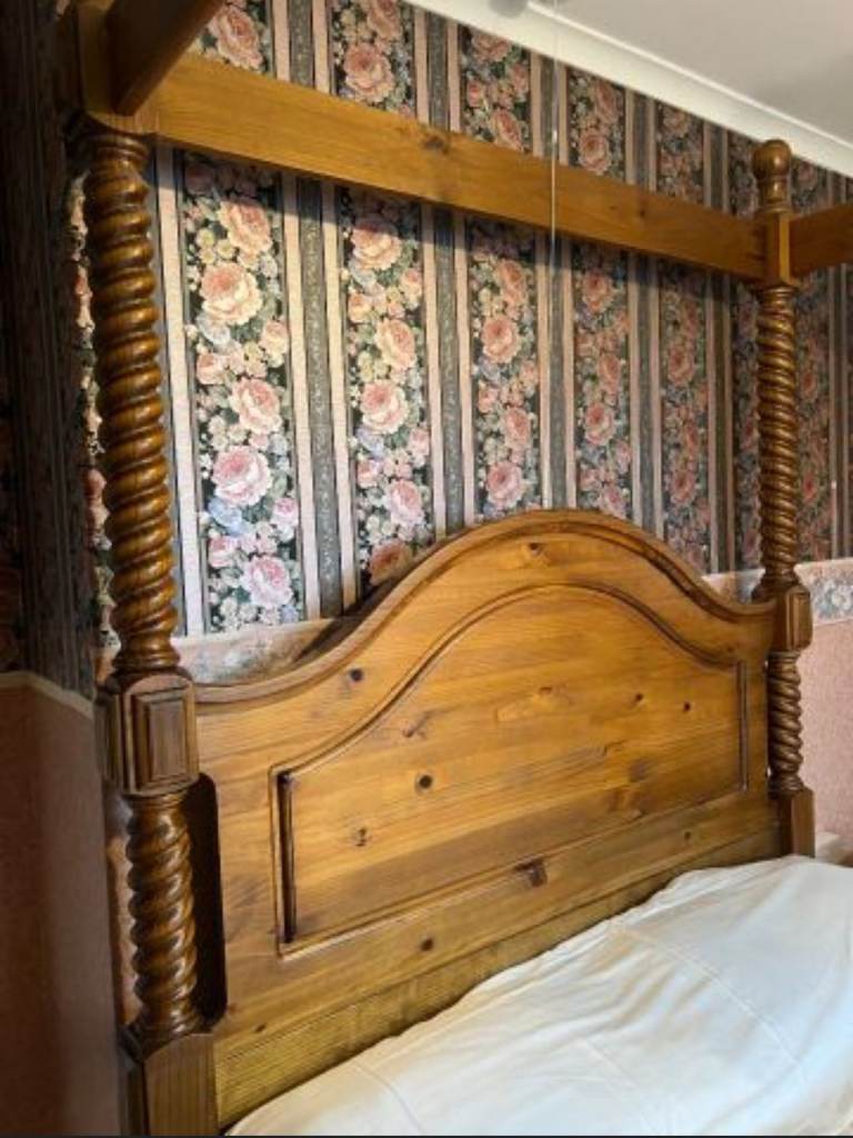 Classic style four poster bed frame for sale due to home renovation. A classic four-poster bed frame made from sturdy oak wood is a timeless choice. The oak wood construction features durability and a natural, warm aesthetic. Can be enhanced with decorations and used as a statement piece. Price is negotiable.