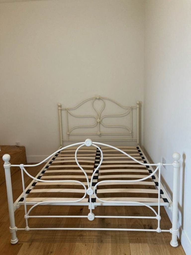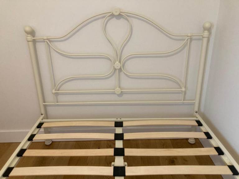 Cream Metal Double Bed Frame with Wooden Slats