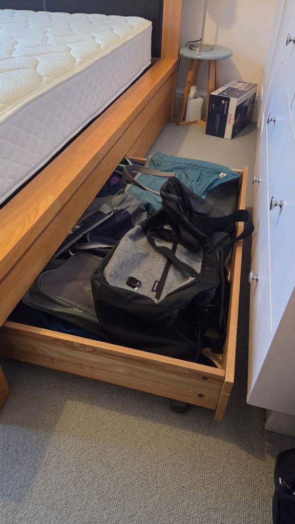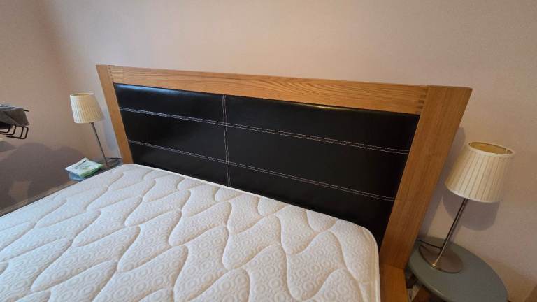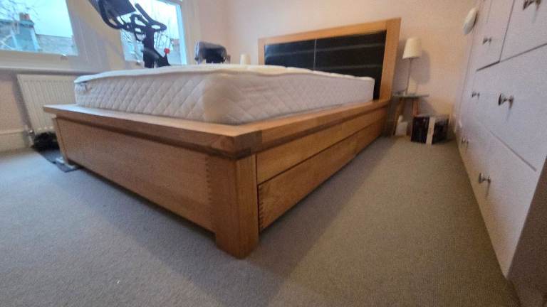Excellent condition wood double bed and head board with mattress. Comes with 4 pull out draws.
