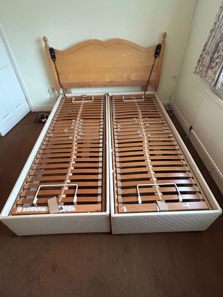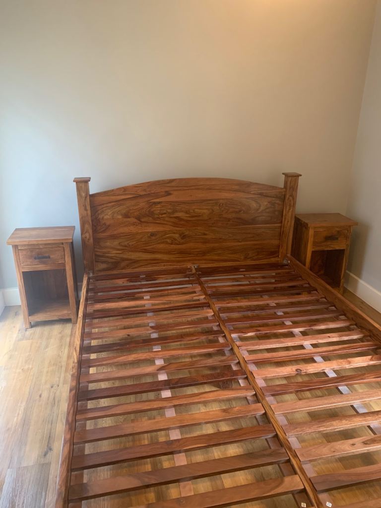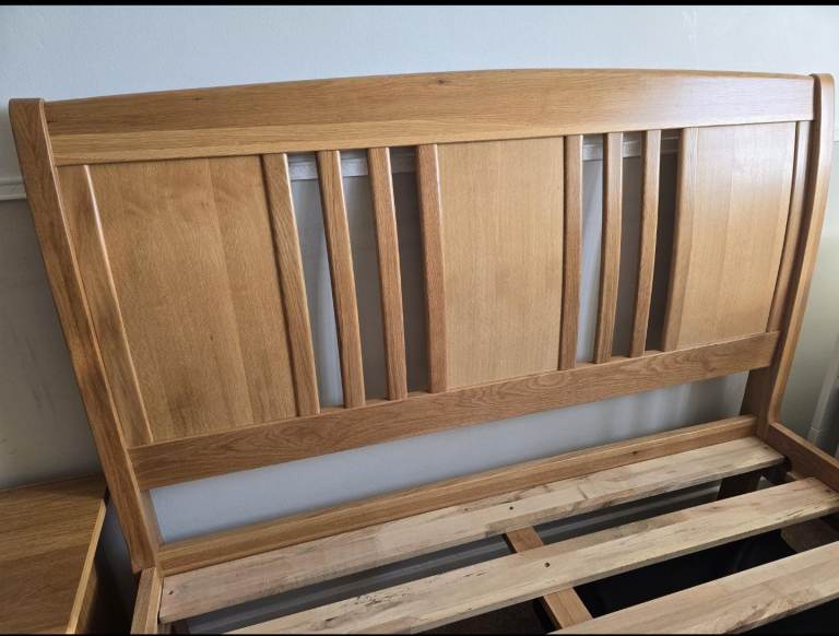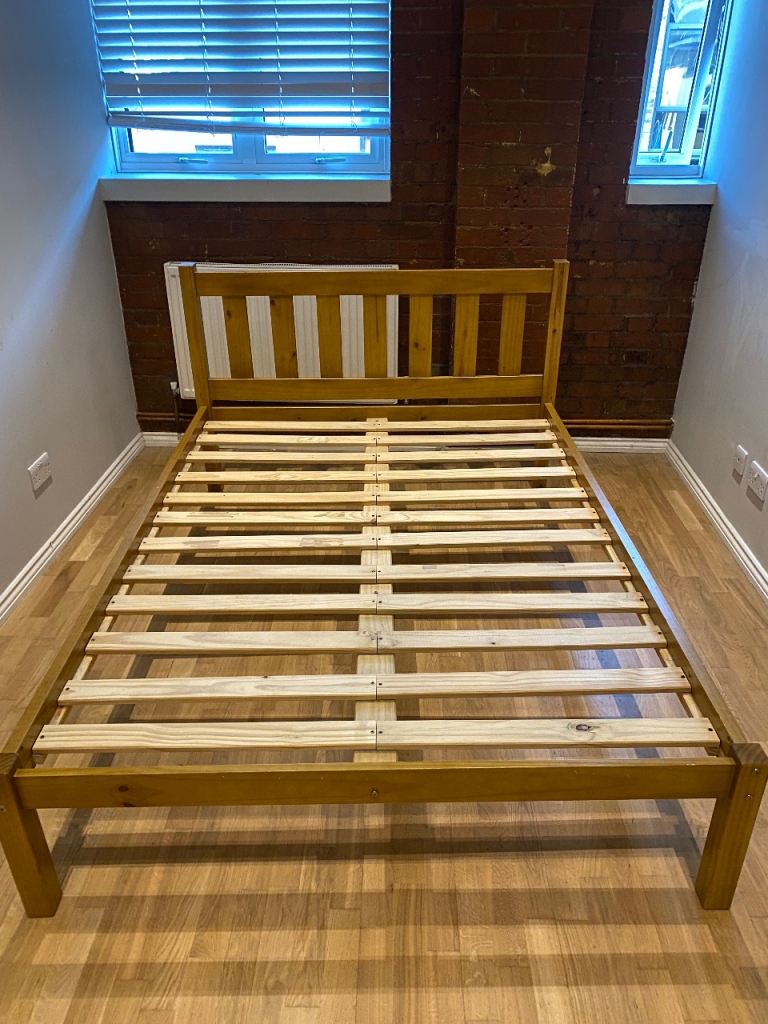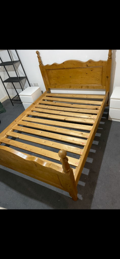 Double bed frame for sale, is dismantle, wooden slats,that’s why I have put up a picture as it built, there is slight damage at the bottom-can be seen in the picture.