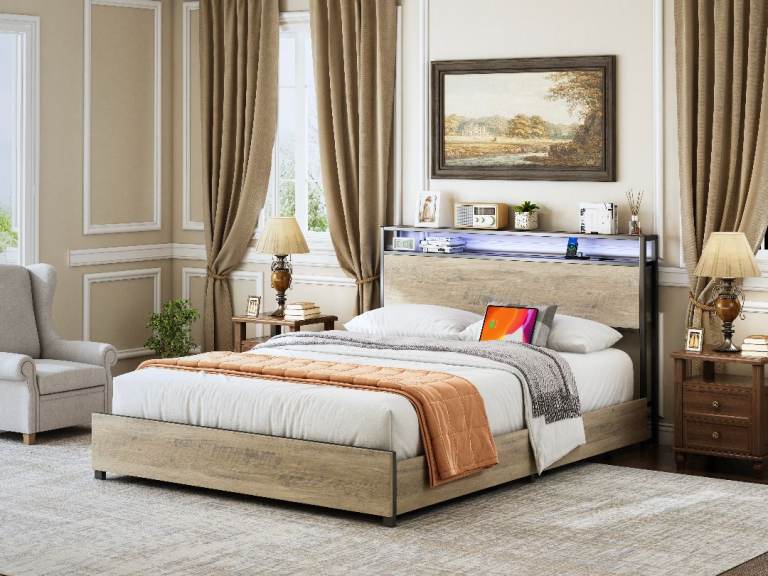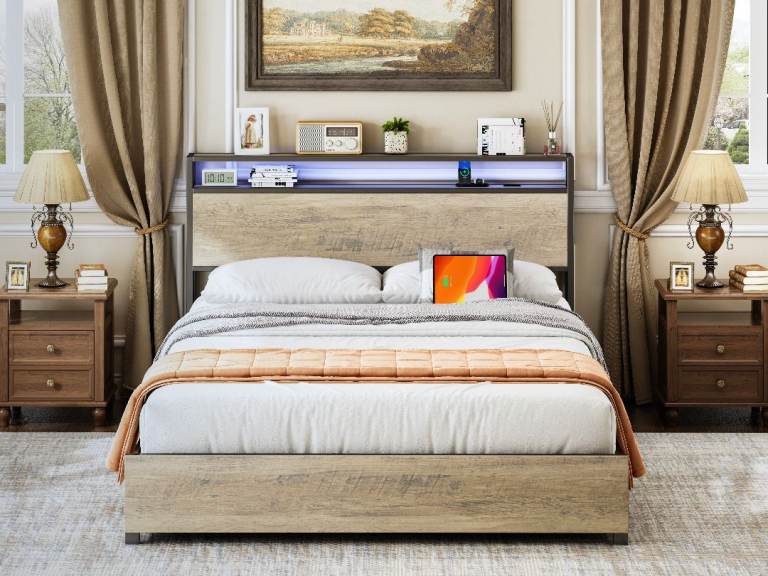 ✨ Modern Double Bed Frame with LED Lighting, Charging Ports, Storage Headboard & Drawers