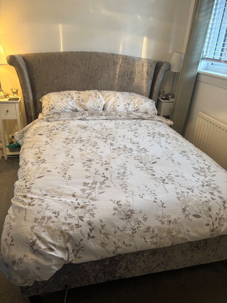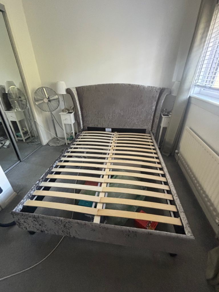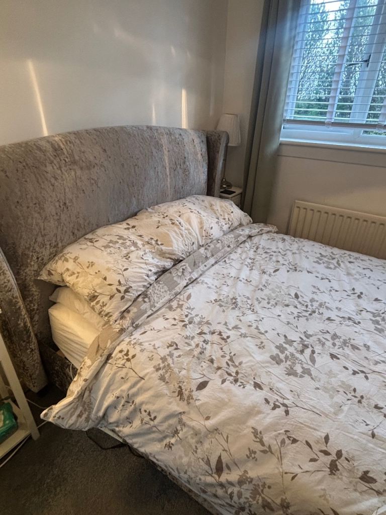 Light grey velvet style headboard.