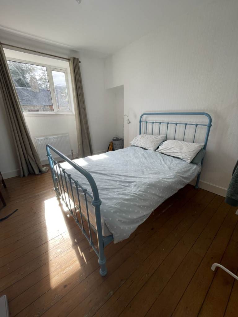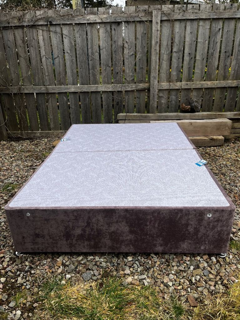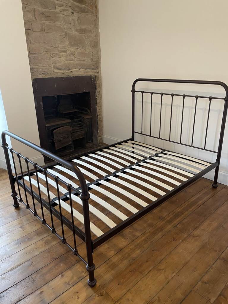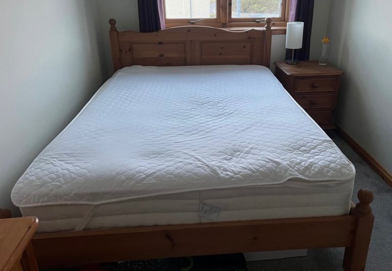 Lovely double bed with a soft pink headboard and sturdy base.
