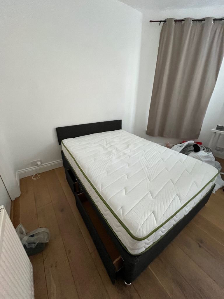 Base of a double bed with 2 drawers in each side. It comes with a headboard but is broken from one side, anyway you can use it if you want. Without mattress.