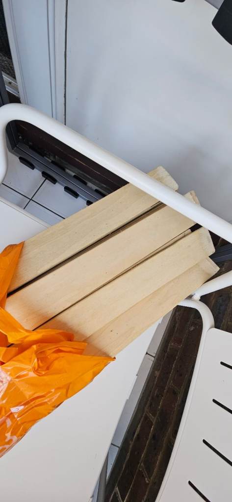 It comes with all wooden slats and has 4 wooden legs. No tears or dents.