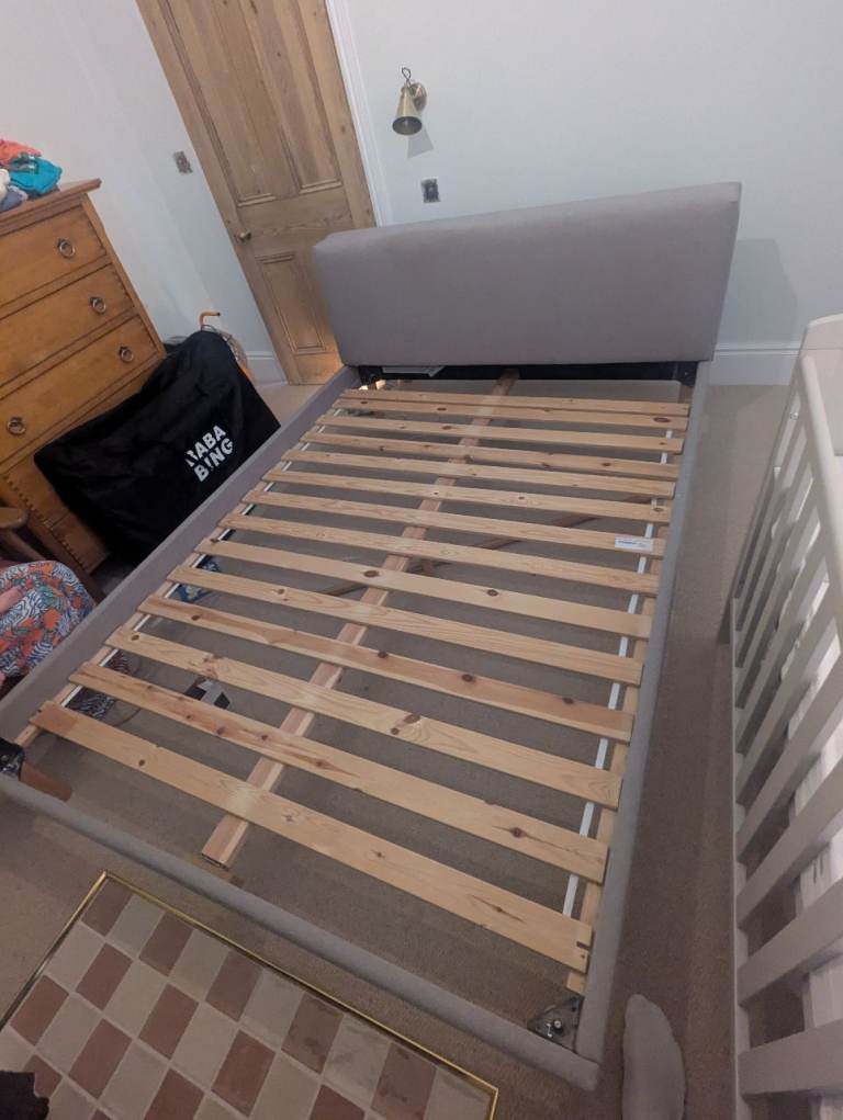 Wooden slatted bedframe and upholstered headboard. Some staining on the headboard but should come out with a clean.