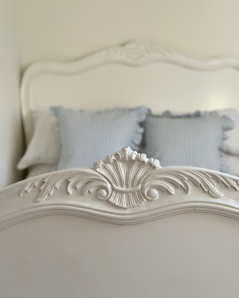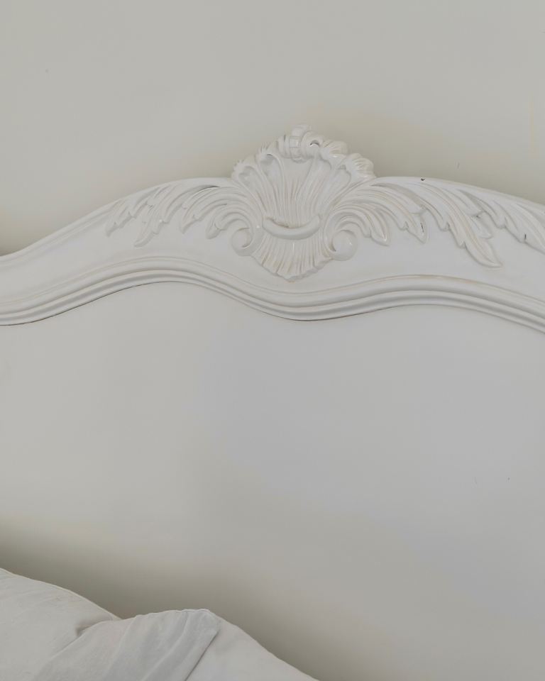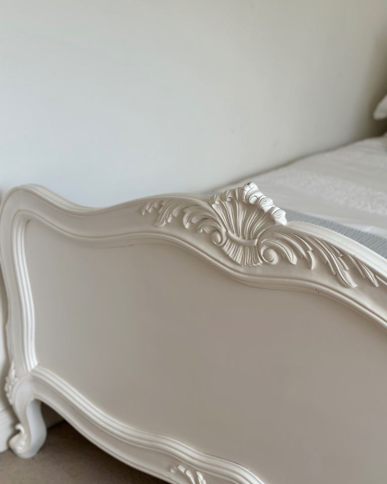 Beautiful French style double bed frame in cream/ivory with elegant carved detailing on both the headboard and footboard.