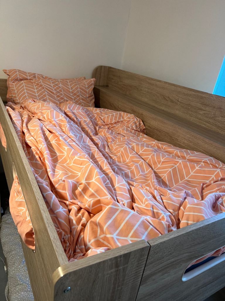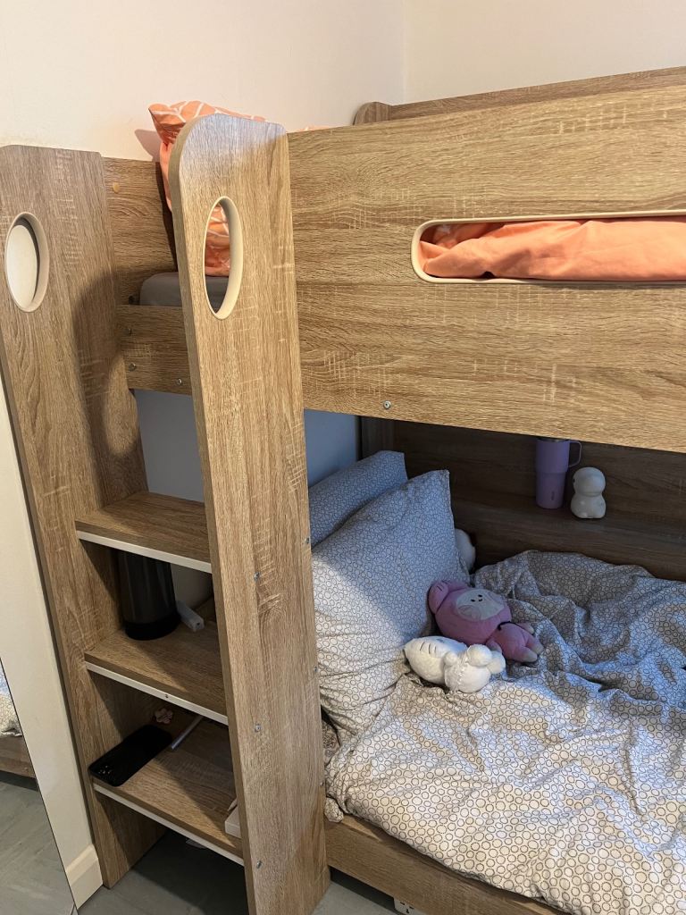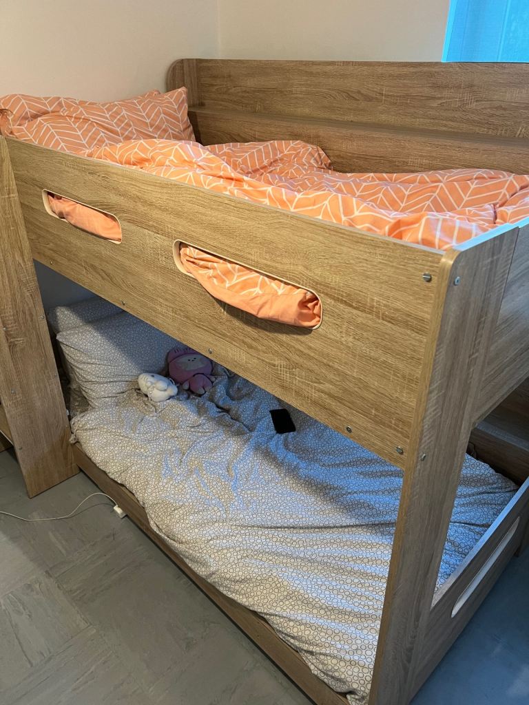 Condition is excellent. Bed does come with mattresses. Beautiful oak colour.
