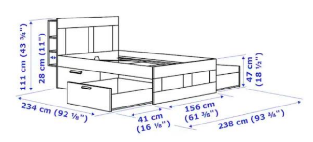 IKEA Brimnes standard king bed with underbed accessible storage (1 drawer) and headboard storage. Mattress not included.