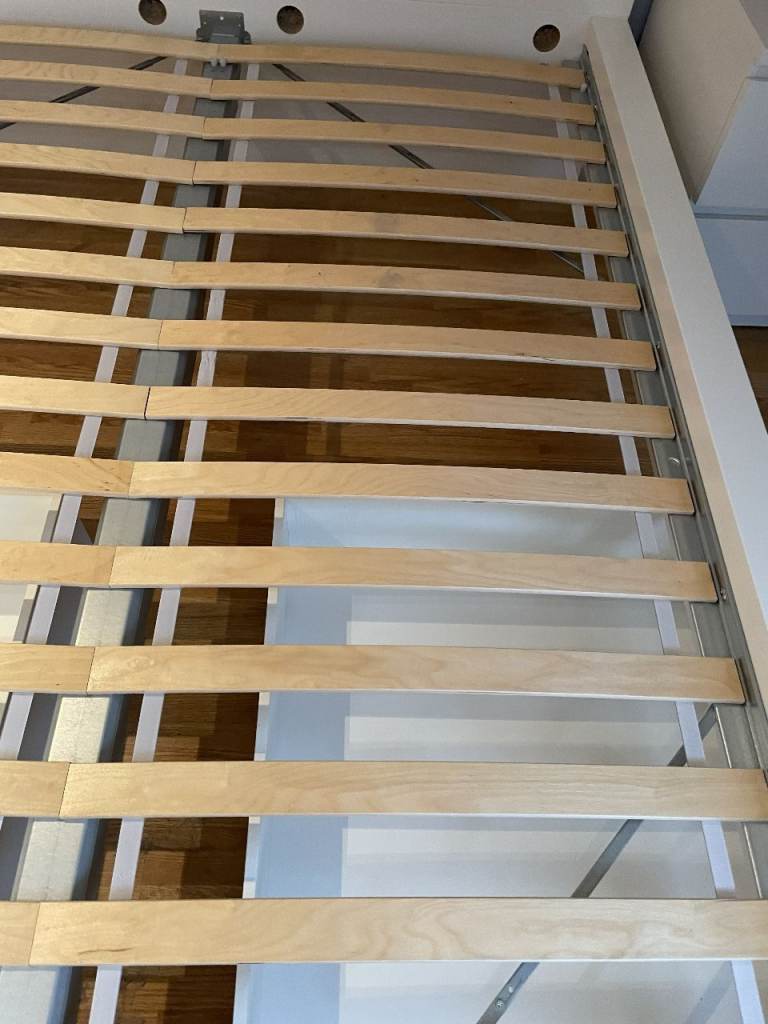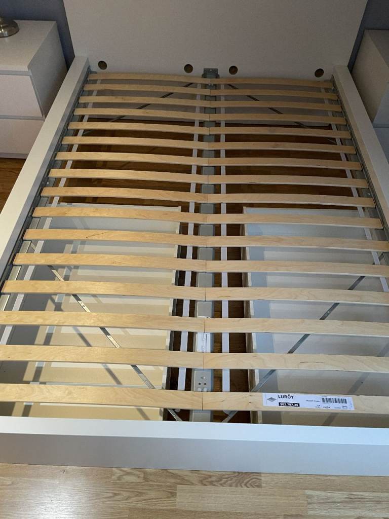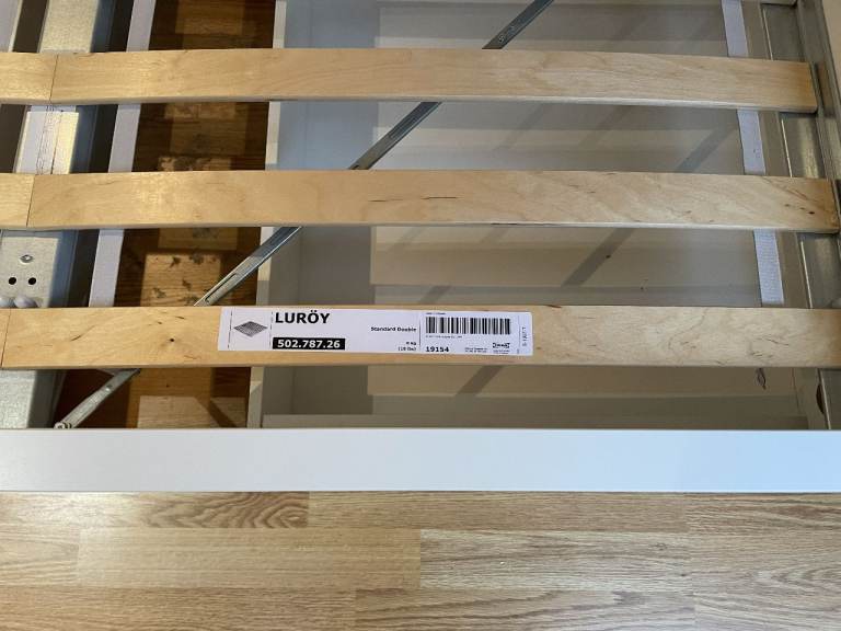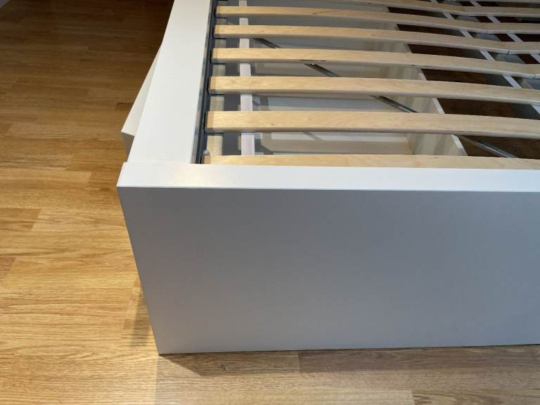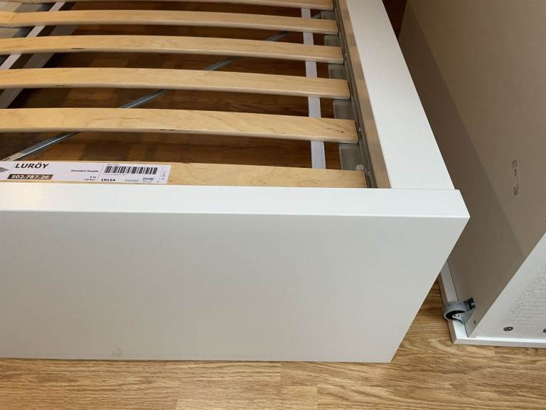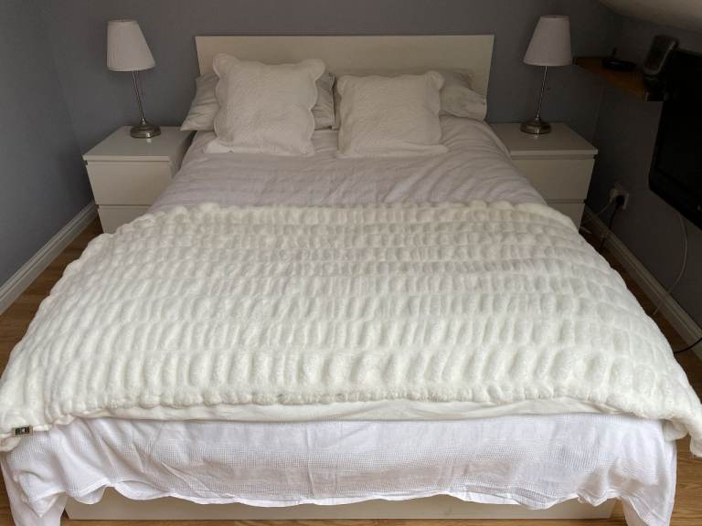 Malm Standard Double Bed, High, White, with Luroy slatted bed base, complete with 2 (underbed) storage boxes. Standard Double bed pocket sprung mattress - Hovag/Vesteroy. All originally from Ikea. Very good condition hardly used. (Bedding shown in 1 photo is not included). Bed is 150cm wide, and 199cm long. Headboard is 100cm high. Storage boxes are 92cm x 59cm, and 15cm deep.