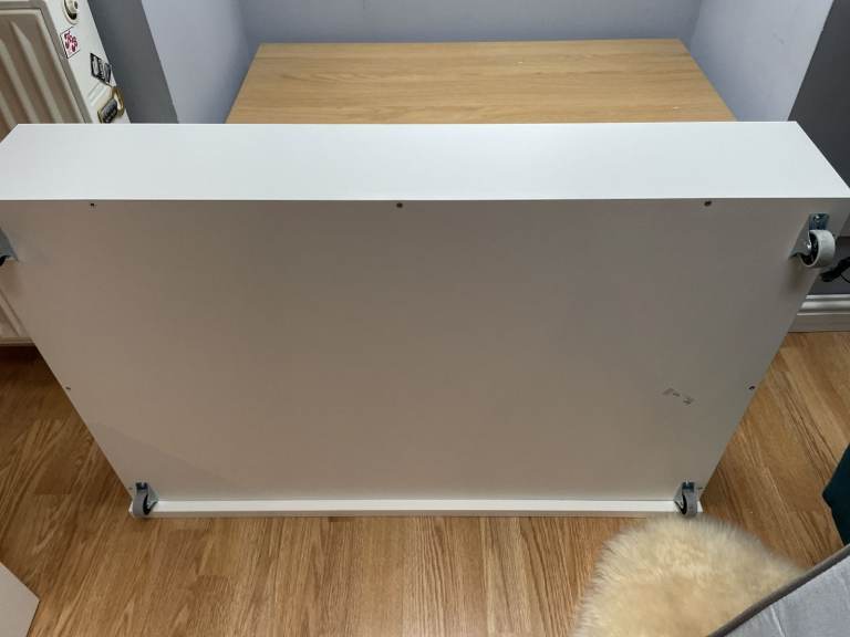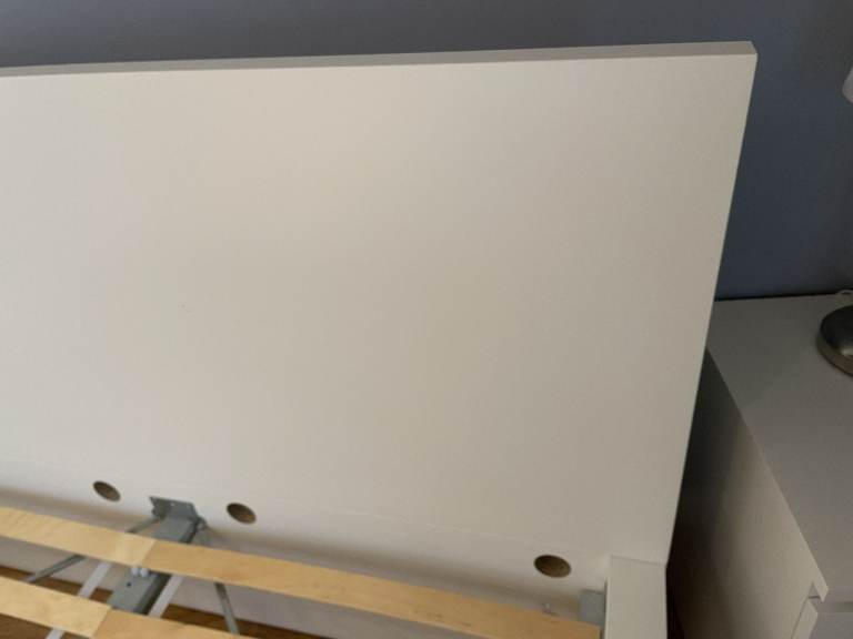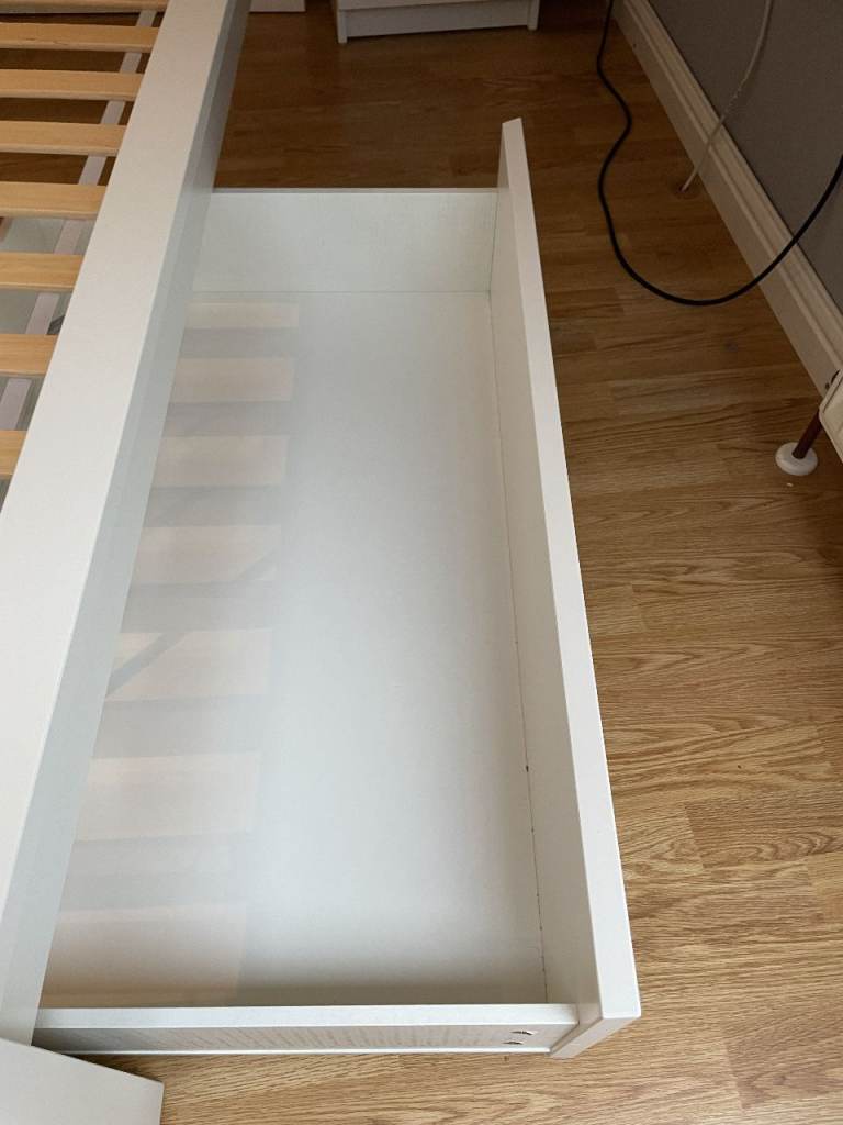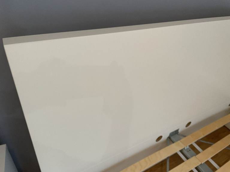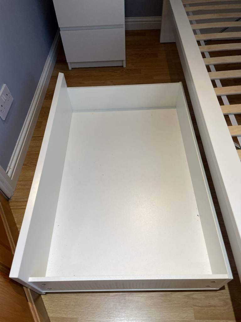 Malm Standard Double Bed, High, White, with Luroy slatted bed base, complete with 2 (underbed) storage boxes. Standard Double bed pocket sprung mattress - Hovag/Vesteroy. All originally from Ikea. Very good condition hardly used. (Bedding shown in 1 photo is not included). Bed is 150cm wide, and 199cm long. Headboard is 100cm high. Storage boxes are 92cm x 59cm, and 15cm deep.