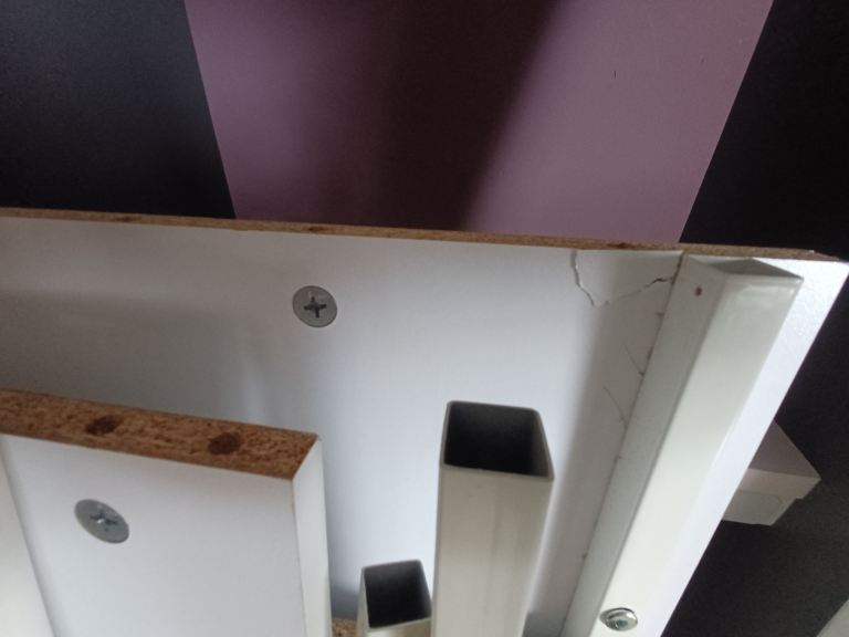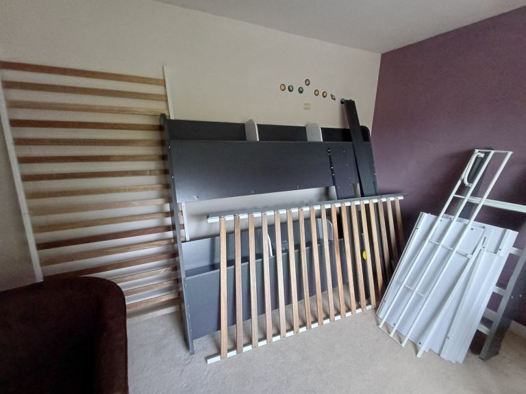 Slight damage to bottom left end panel where the screw/dowel fits into the frame but should not affect the use or stability of the bunk bed.