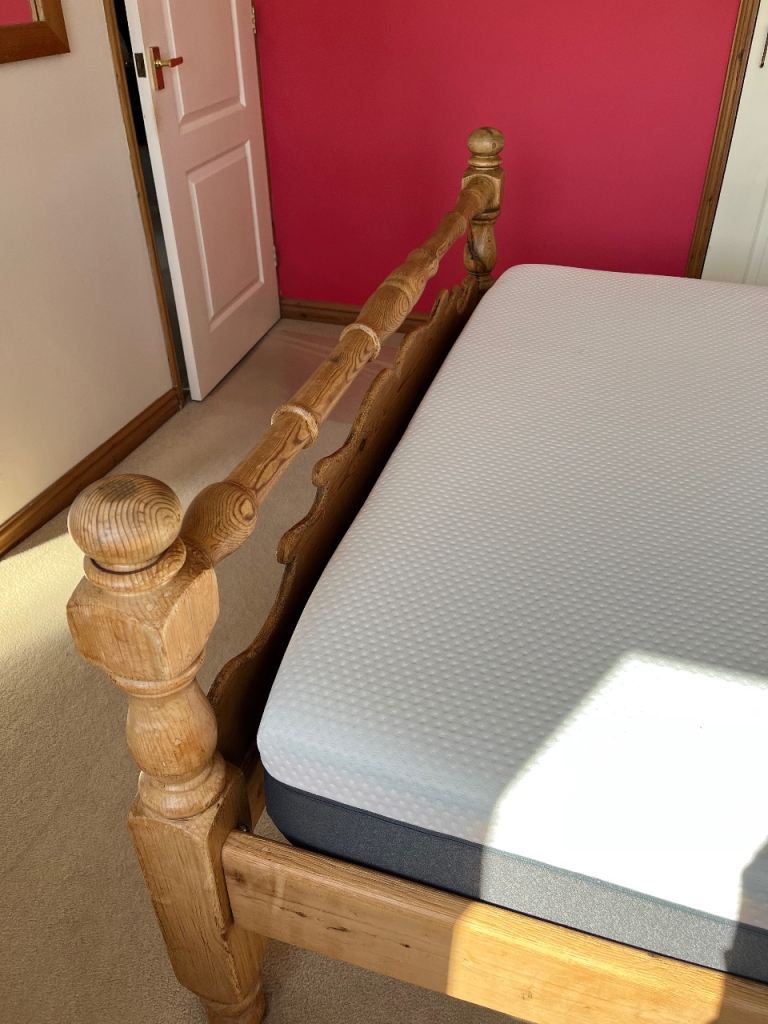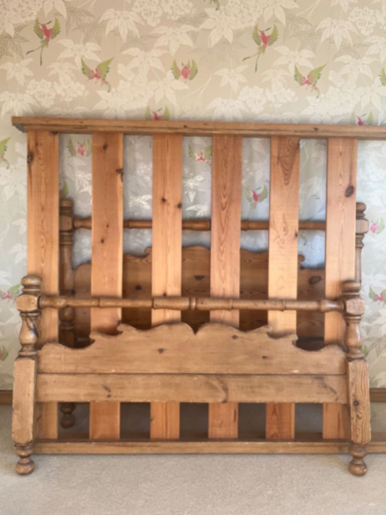 Good quality antique pine king sized bed in solid wood. Wooden slatted base.