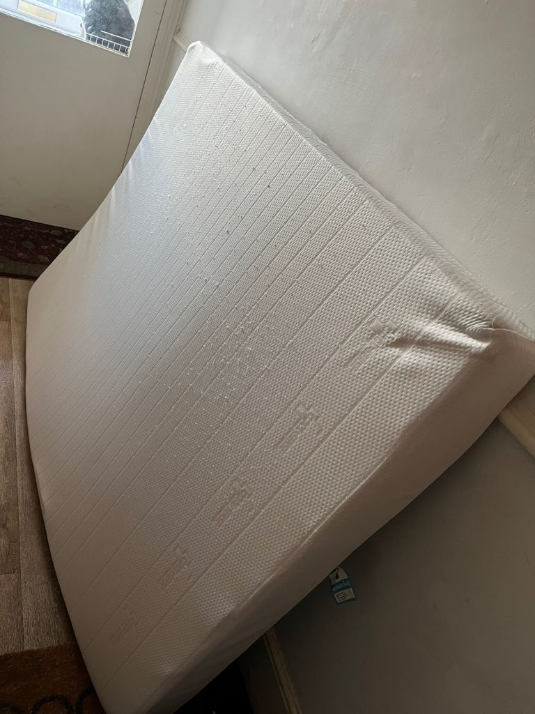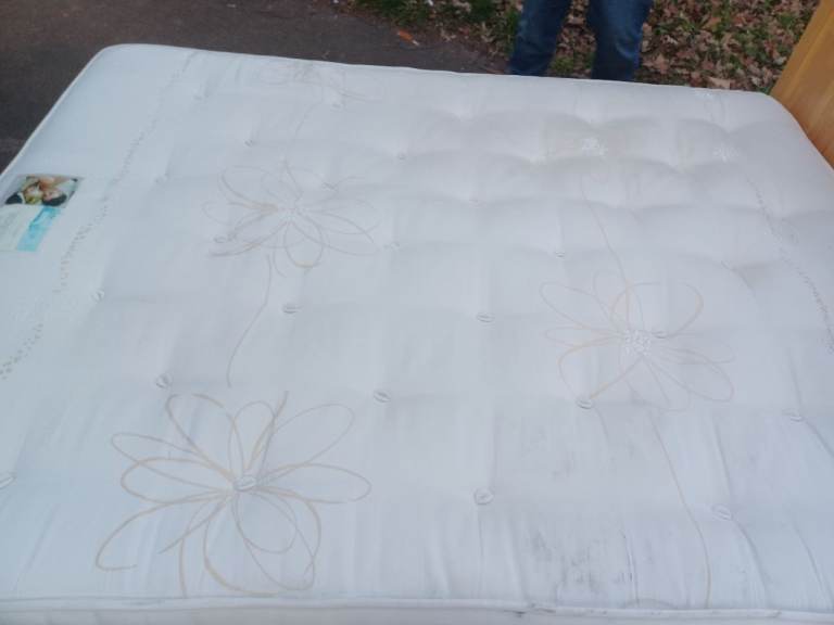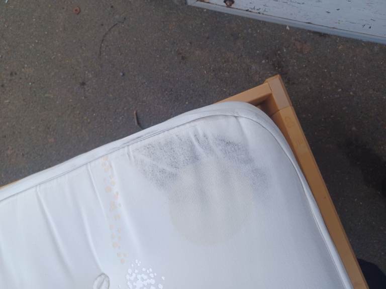 Whilst moving it we went and marked matteress in a couple of places which is shown in picture 6,7,8, I should think they would wipe of with fabric cleaner .the matteress is not stained and is clean apart from the marks .