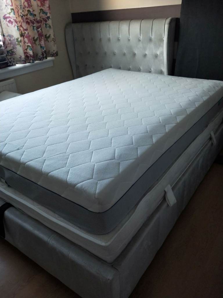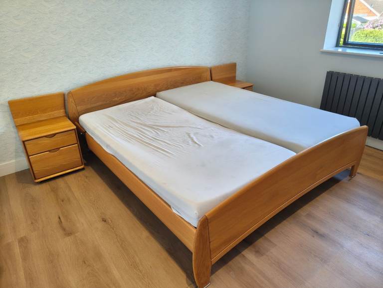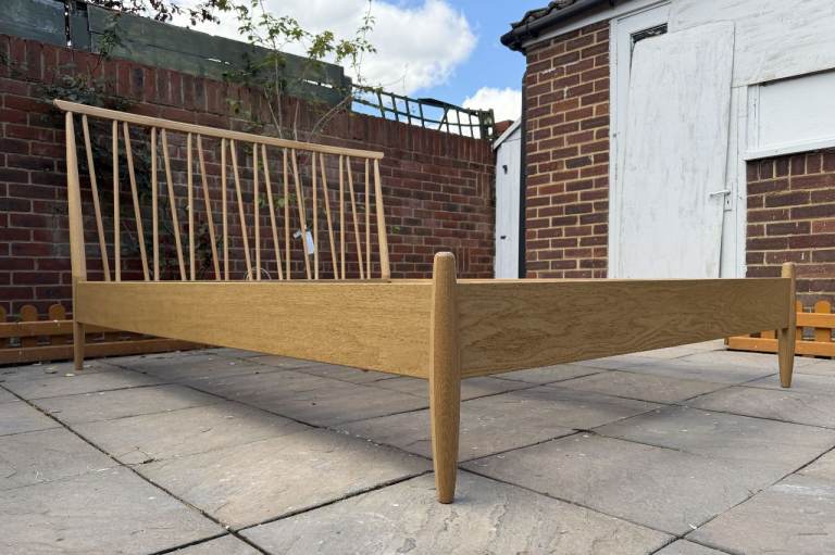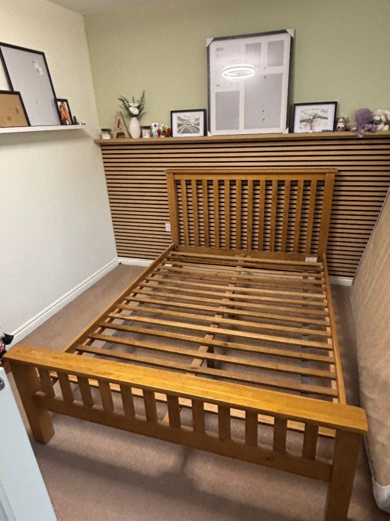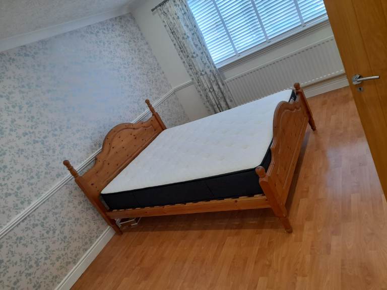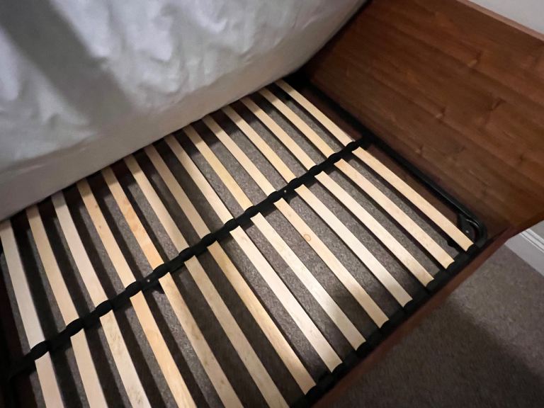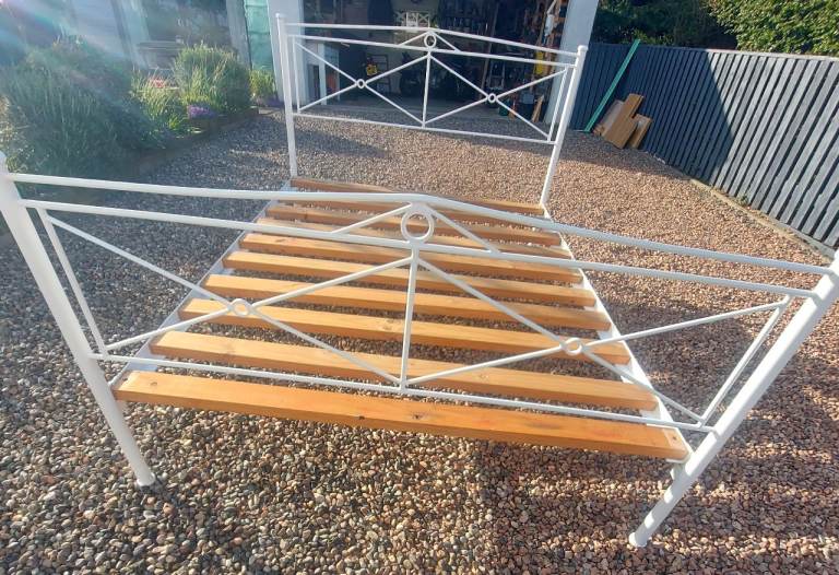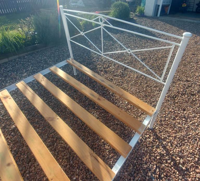 White Wrought Iron Bed, KING SIZE FRAME (Headboard 111cm High x 158cm Wide, Base end 91cm High x 158cm Wide.) Timber slats. In good condition.