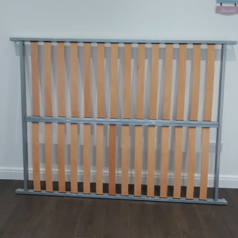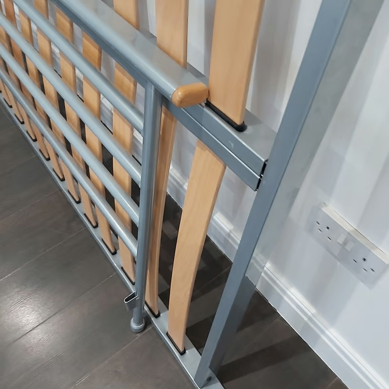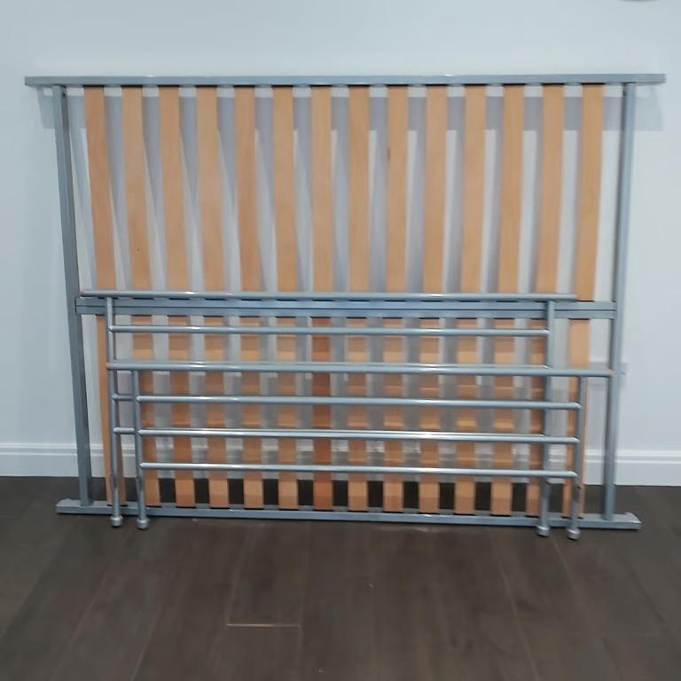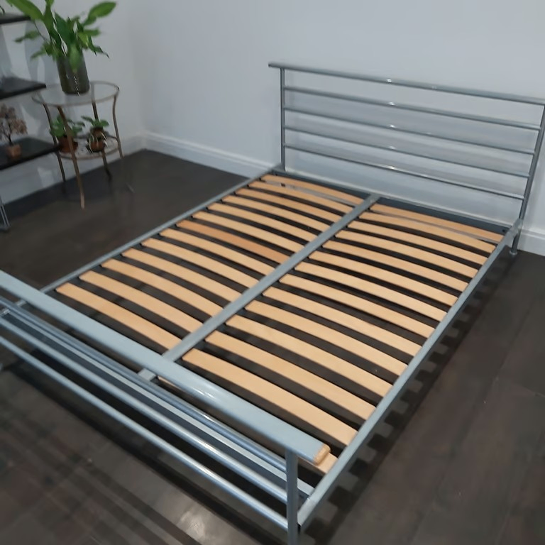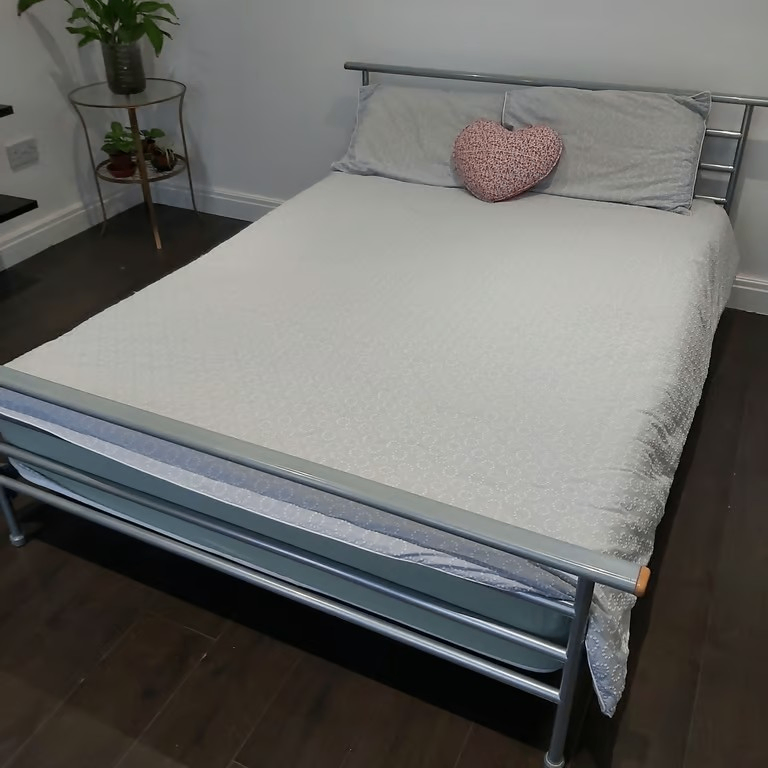 A metal double bed in mainly grey / silver finish with spring mattress.