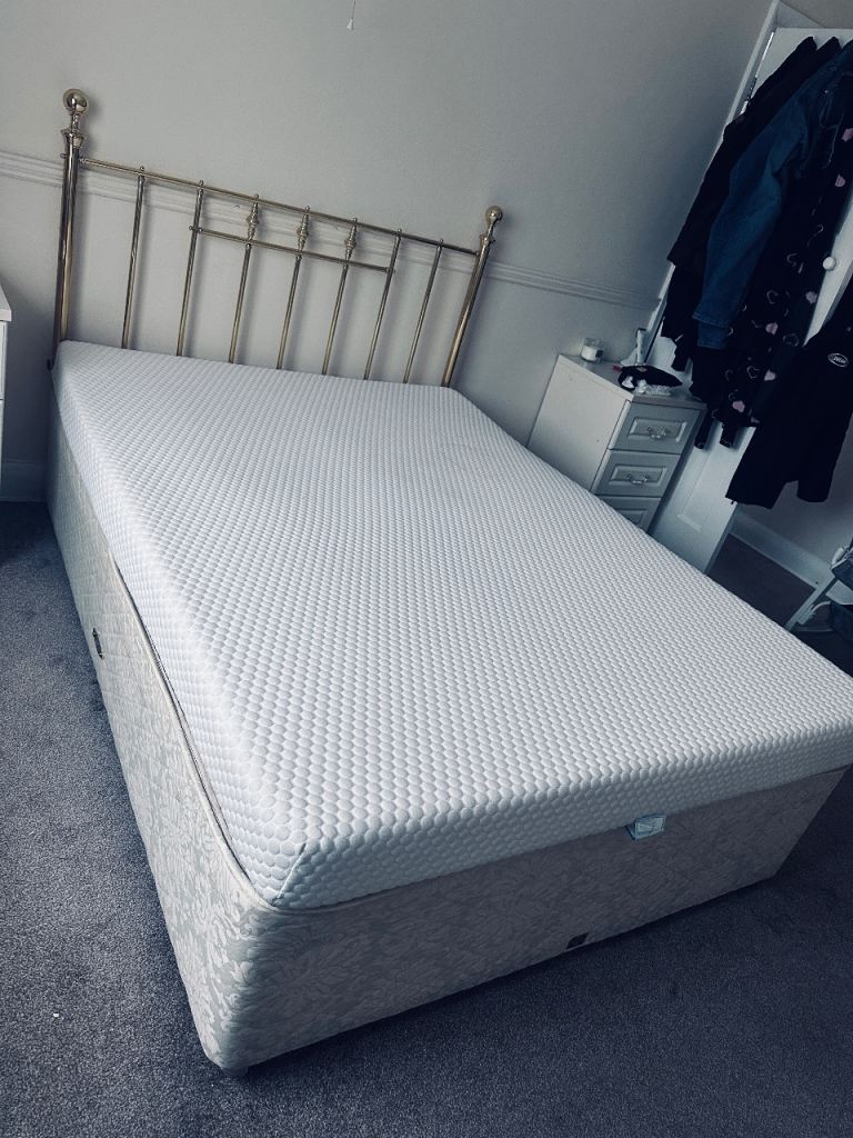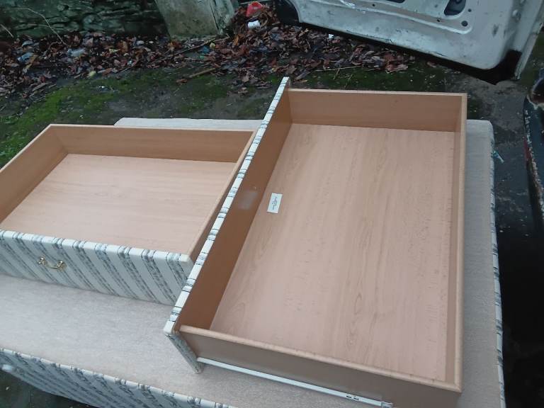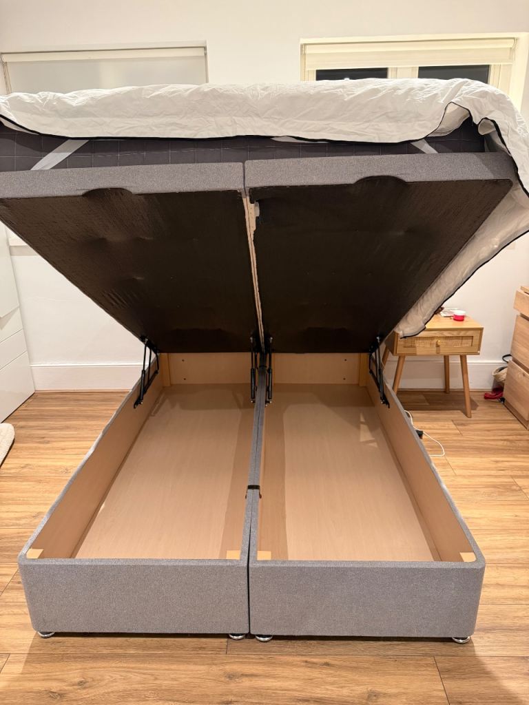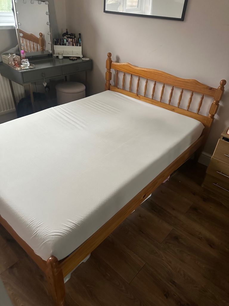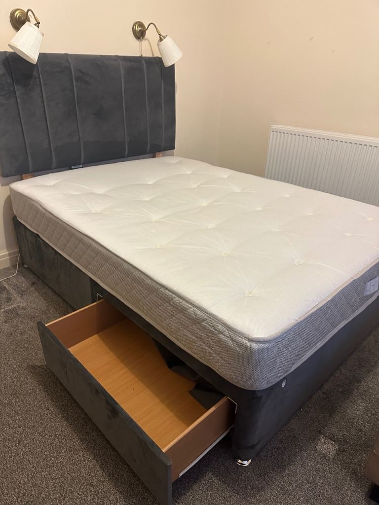 In good condition. Clean mattress. 4 draws. King size bed. Can deliver any area and time for a small fee.