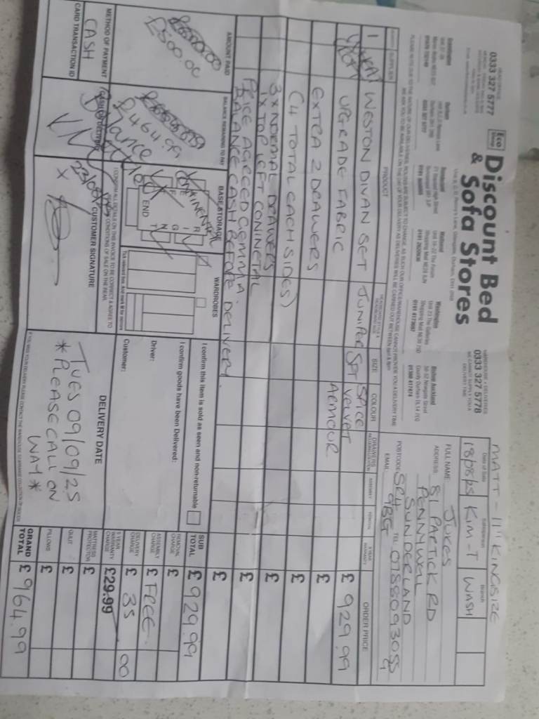 Receipt..4 drawers. Too big for us ,mattress